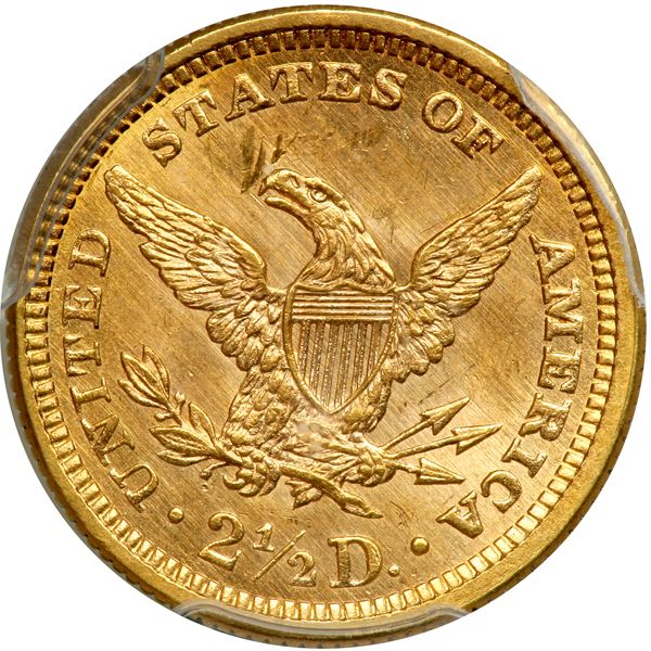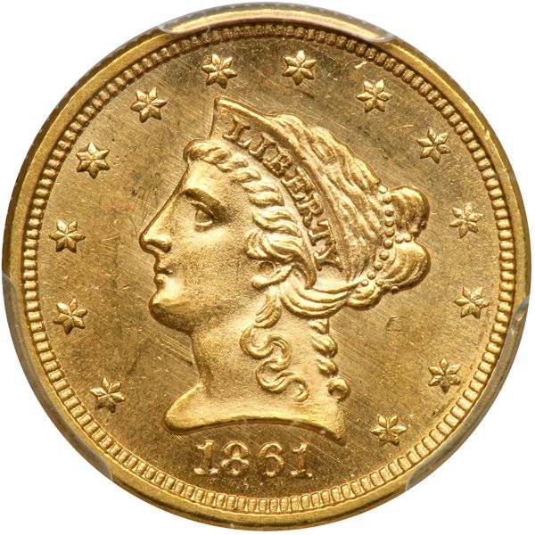 1861 $2.50 Liberty. PCGS graded MS-64 CAC Approved. New reverse. Bold strike with reflective fields. Tremendous detail from a very positive strike, which collectors like better to see than wishy-washy detail; furthermore, the surfaces show sharp golden hues. The mint luster rolls around both sides with a pleasing reflective sheen, and none of the features reveal any bothersome distractions. Possibly this piece was one of the earliest from new dies, judging by the prooflike tendencies. Pop 80; 35 finer (PCGS # 7794) .