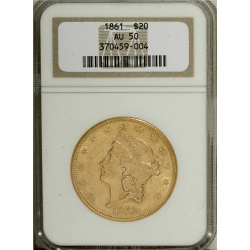 1861 $20 AU50 NGC. At one time, the 1861 double eagle