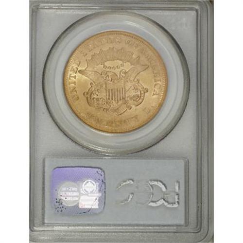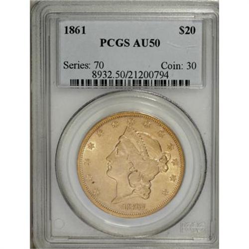 <B>1861 $20 AU50 PCGS.</B></I> An attractive, lightly circulated example of this popular type issue, luminous yellow-gold with hints of green in the faintly abraded fields. On the softly struck portrait, an abrasion is noted along Liberty's jawline. A small alloy spot is noted between the first two stars of the obverse.<BR><BR><B>Coin Engraver:</B> James B. Longacre<BR><BR><b>Shipping:</b> Coins & Currency (<a target="_blank" href="http://www.heritageauctions.com/common/shipping.php">view shipping information</a>)