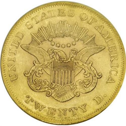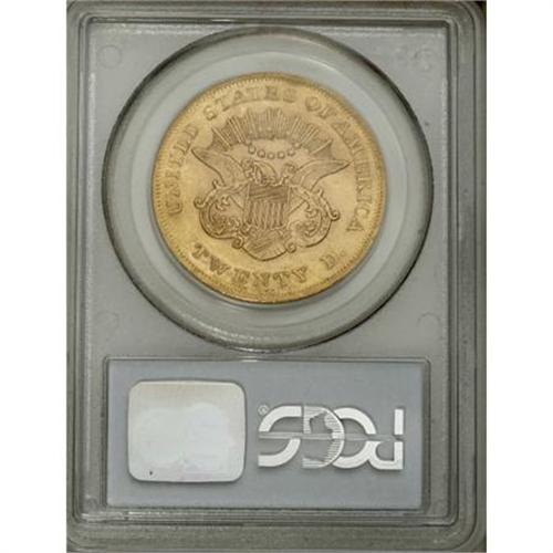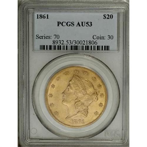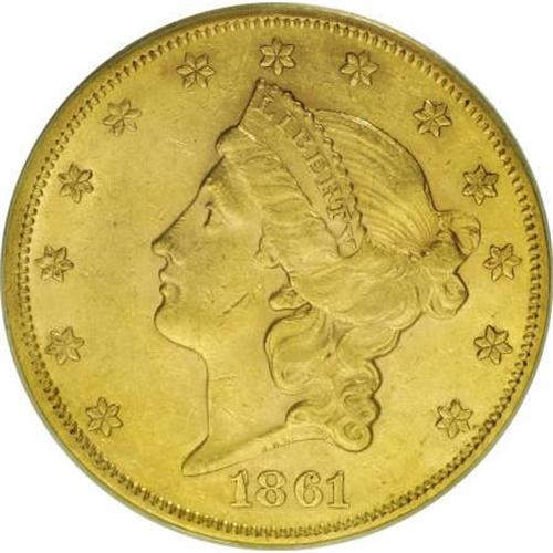 <B>1861 $20 AU53 PCGS.</B></I> PCGS Population (121/551). NGC Census: (251/1322). Mintage: 2,976,453. Numismedia Wsl. Price for NGC/PCGS coin in AU53: $790. (#8932)<BR><BR><B>Coin Engraver:</B> James B. Longacre<BR><BR><b>Shipping:</b> Coins & Currency (<a target="_blank" href="http://www.heritageauctions.com/common/shipping.php">view shipping information</a>)