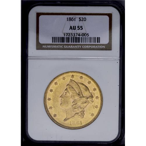 <B>1861<$20> AU55 NGC.</B></I> An attractive apricot-gold slider with nearly full reverse luster despite a hint of rub on the wingtips. The absence of heavy marks confirms the eye appeal.
