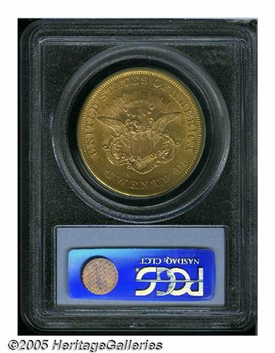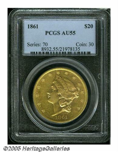 <B>1861<$20> AU55 PCGS.</B></I> A pleasing example of this popular Type One issue with nearly full luster and excellent light yellow-gold color, accented by wisps of pink toning. Although light abrasions are present, the surfaces are much finer than usually seen.
