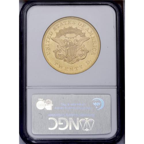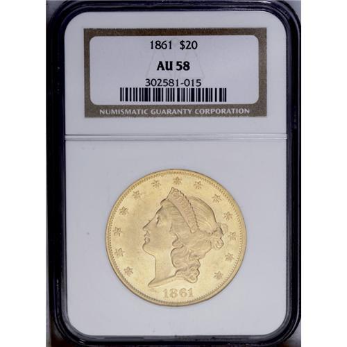 <B>1861 $20 AU58 NGC.</B></I> This Civil War issue retains considerable luster on bright pink-gold surfaces. Well struck design features, and a couple of moderate marks show on the shield on the reverse. This piece presents a nice overall appearance.