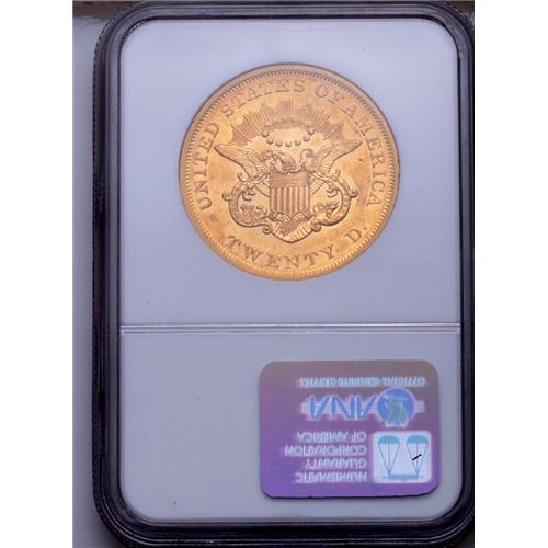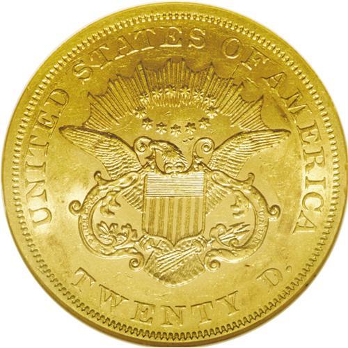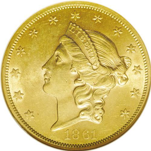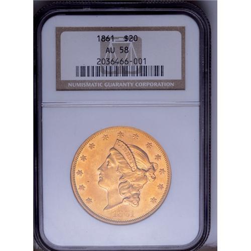 <B>1861<$20> AU58 NGC.</B></I> This is the highest mintage Type One double eagle, with a total production of just under 3 million coins. In fact, it has the highest mintage of any double eagle issued before 1904, and the total face value of nearly 60 million dollars was the highest total of any single United States coinage issue until 1904. Until the discovery of the <I>S.S. Brother Jonathan</B></I> and <I>S.S. Central America</B></I> treasures, this date was handily the most plentiful of any Type One double eagle, and the obvious choice for type collectors. The Wyoming Collection specimen is a lovely example with smooth, mark-free surfaces and rich orange-gold luster. All of the design elements are boldly defined, exhibiting exceptional detail. Heavy clash marks from the rays are visible behind Liberty's head. The digit 8 in the date is centered beneath the JBL initials. More discussion regarding the obverse and reverse dies can be found in the listing for the 1861 Paquet double eagle.<BR><I>From The Wyoming Collection.</B></I>