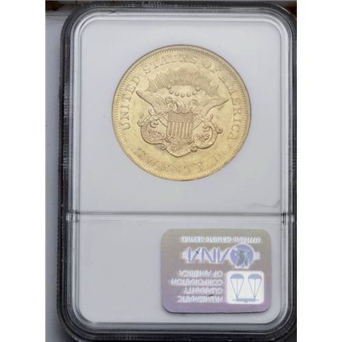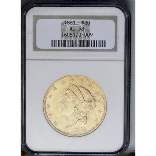 <B>1861<$20> AU58 NGC.</B></I> This near-Mint example is lightly worn and mildly abraded, with pleasing, nearly full luster and attractive peach-gold and slightly greenish coloration.
