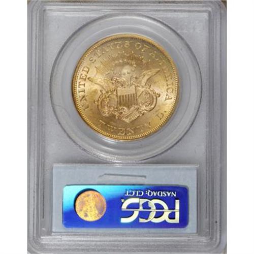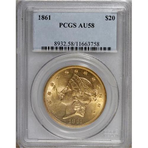 <B>1861 $20 AU58 PCGS.</B></I> Flashy and fully lustrous, with lovely honey-golden toning, this example is well struck and seems free of highpoint wear. A few noticeable abrasions and some wispy hairlines limit the grade. As the most common Type One double eagle, this issue is quite popular among type collectors. <BR><BR><B>Coin Engraver:</B> James B. Longacre<BR><BR><b>Shipping:</b> Coins & Currency (<a target="_blank" href="http://www.heritageauctions.com/common/shipping.php">view shipping information</a>\)