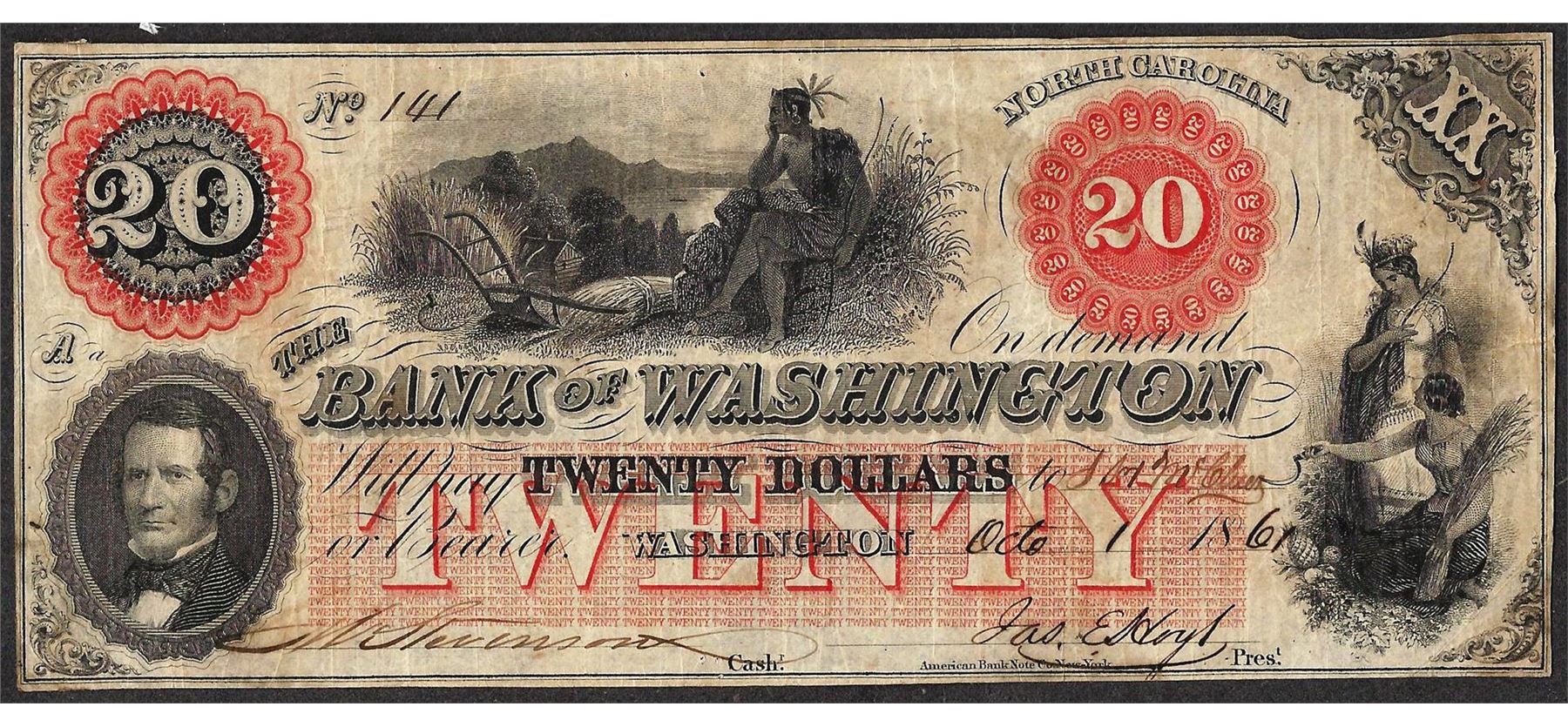 One 1861 $20 Bank of Washington North Carolina Obsolete Note.