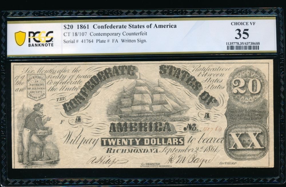 One 1861 $20 CT-18 Confederate PCGS 35.