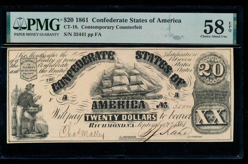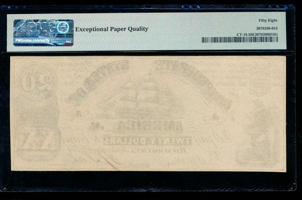 One 1861 $20 CT-18 Confederate PMG 58EPQ.