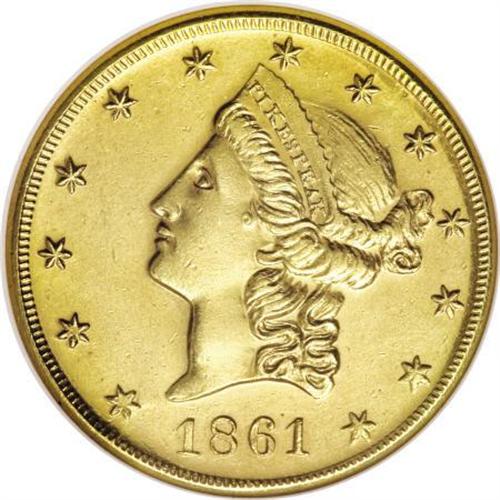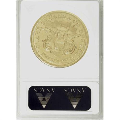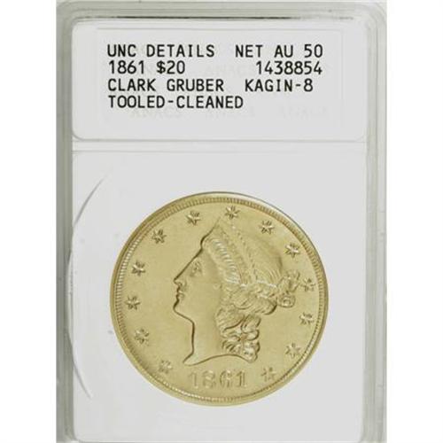 <B>1861 $20 Clark, Gruber & Co. Twenty Dollar--Tooled, Cleaned--ANACS. Unc Details, Net AU50.</B></I> K-8, High R.5. There is a star immediately to the right of the coronet tip, and on the reverse the V in DENVER is recut over an N. <BR> Clark, Gruber & Co. established a "bank and mint" in Denver in 1860, opening for business on July 10. The mint facility was completed by the 16th, and on July 20 the firm invited newspaper editors and dignitaries to come inspect the new facility. The 1860 coinage consisted of quarter eagles and half eagles that greatly resembled Federal gold pieces, along with the famous "Pike's Peak Gold" eagle and double eagle coins, from dies produced by an engraver who had manifestly never seen that picturesque peak. The 1861 pieces consisted of the same four denominations, but the tens and twenties were redesigned to the more familiar--and aesthetically pleasing--Federal-type designs. PIKES PEAK appears on Liberty's coronet on all four 1861 denominations.<BR> In 1861 the Federal government began issuing paper currency to finance the Civil War. Unknown to many coin collectors who are not also paper money aficionados, Clark, Gruber & Co. also issued paper currency; at first the bills were five dollar demand notes, payable in gold at the Denver office. Soon afterward, one, two, and three-dollar notes followed. These well-produced notes were also well received, creating the unusual situation where, by 1862, the Clark, Gruber currency actually traded at a premium to the Federal paper. They were, after all, redeemable in gold at par from a local establishment, whereas the Federal government had suspended specie payments as of December 18, 1861.<BR> This remains an extremely attractive and rare coin, despite the modest attempts at "improvement." The hair details appear to have been reengraved, and the tailfeathers of the eagle and the fletchings appear suspiciously sharp. The yellow-green surfaces are overly bright from a cleaning, but they are also nearly mark-free, with the exception of a few trivial abrasions seen under a loupe. A beautiful coin of this rare Territorial type. Listed on page 367 of the 2008 <I>Guide Book.</B></I><BR> <BR><BR><b>Shipping:</b> Coins & Currency (<a target="_blank" href="http://www.heritageauctions.com/common/shipping.php">view shipping information</a>)