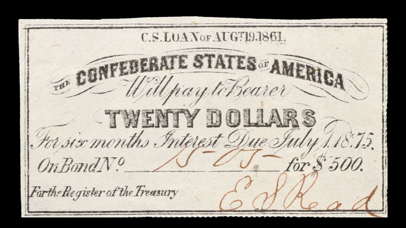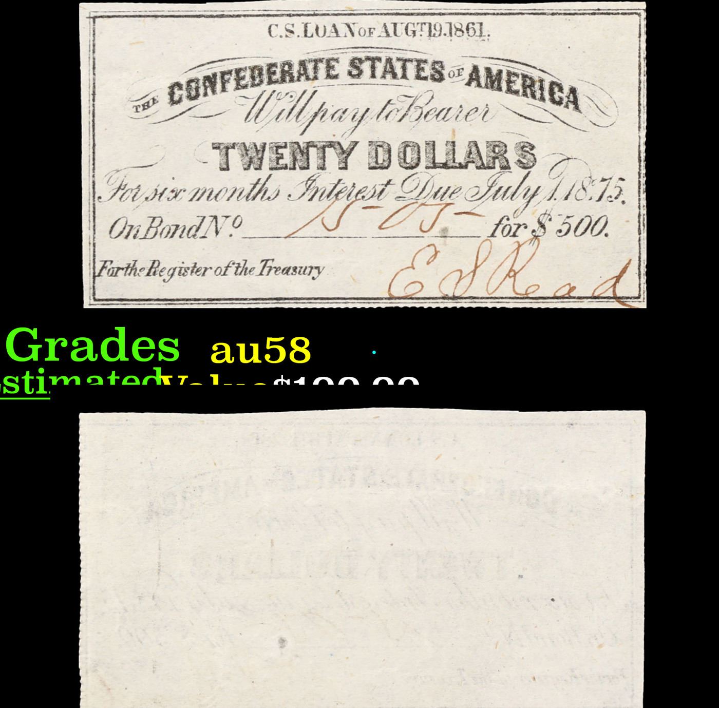1861 $20 Confederate Note CSA Grades Choice AU/BU Slider. 0