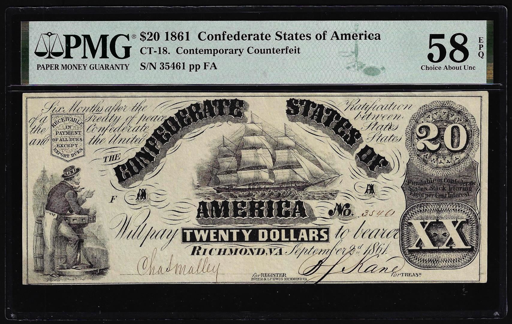 One 1861 $20 Confederate States Contemporary Counterfeit Note CT-18 PMG Ch. About Unc 58EPQ. PMG Certified.