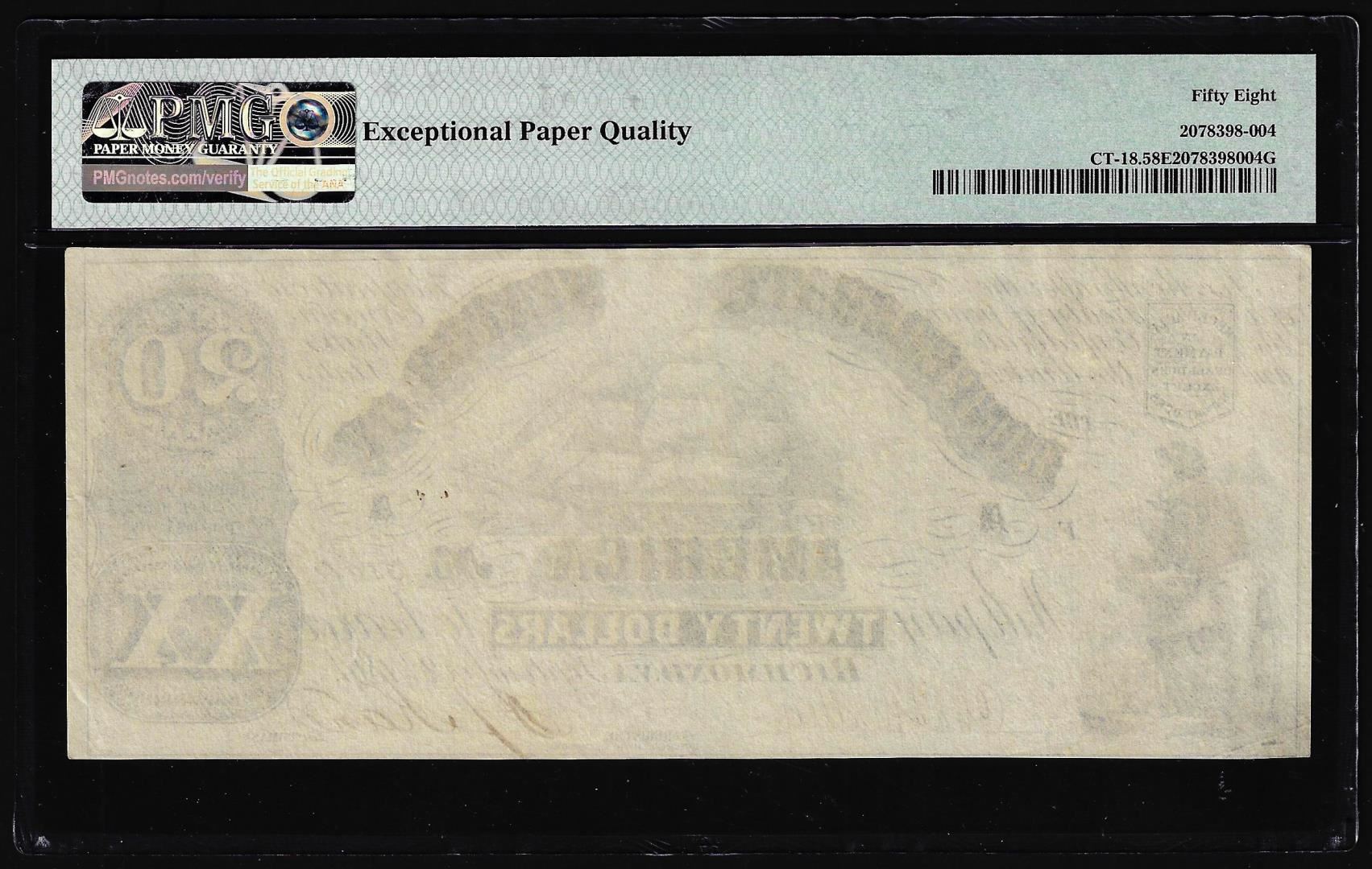 One 1861 $20 Confederate States Contemporary Counterfeit Note CT-18 PMG Ch. About Unc 58EPQ. PMG Certified.