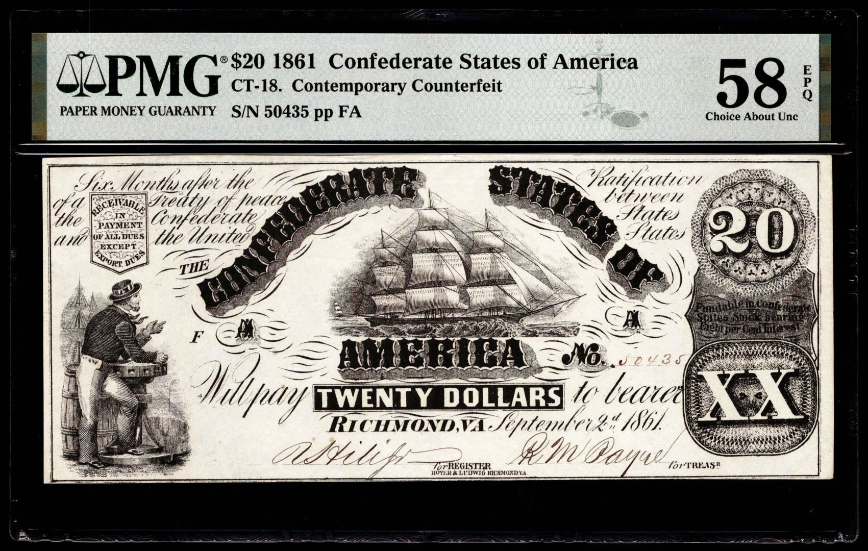 1861 $20 Confederate States Contemporary Counterfeit Note PMG Choice About Unc 58EPQ