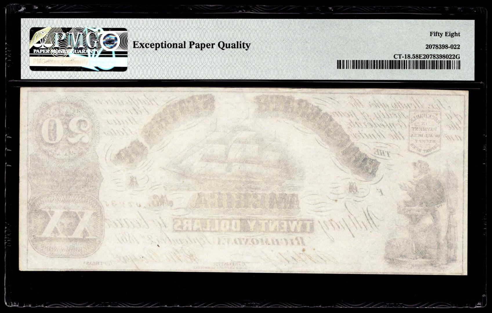 One 1861 $20 Confederate States Contemporary Counterfeit Note PMG Choice About Unc 58EPQ. PMG Certified.