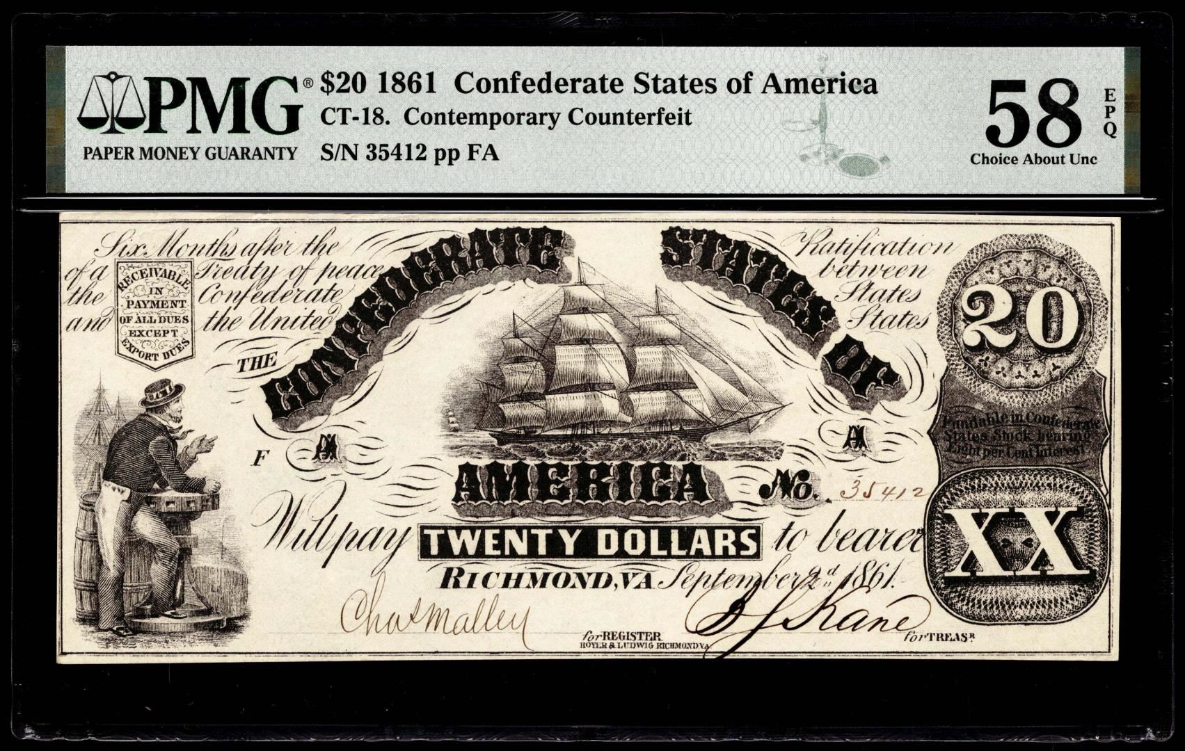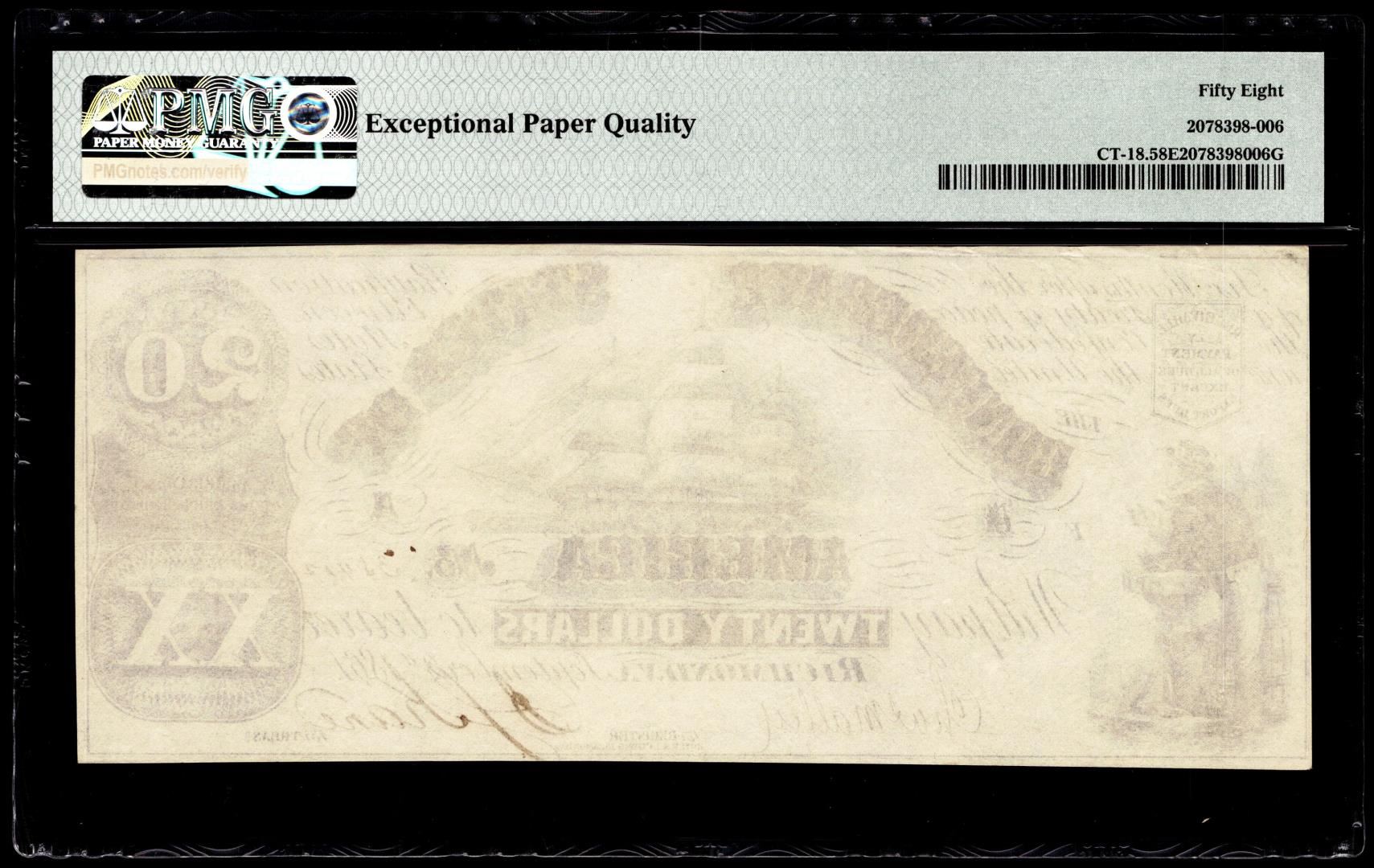 One 1861 $20 Confederate States Contemporary Counterfeit Note PMG Choice About Unc. 58EPQ. PMG Certified.