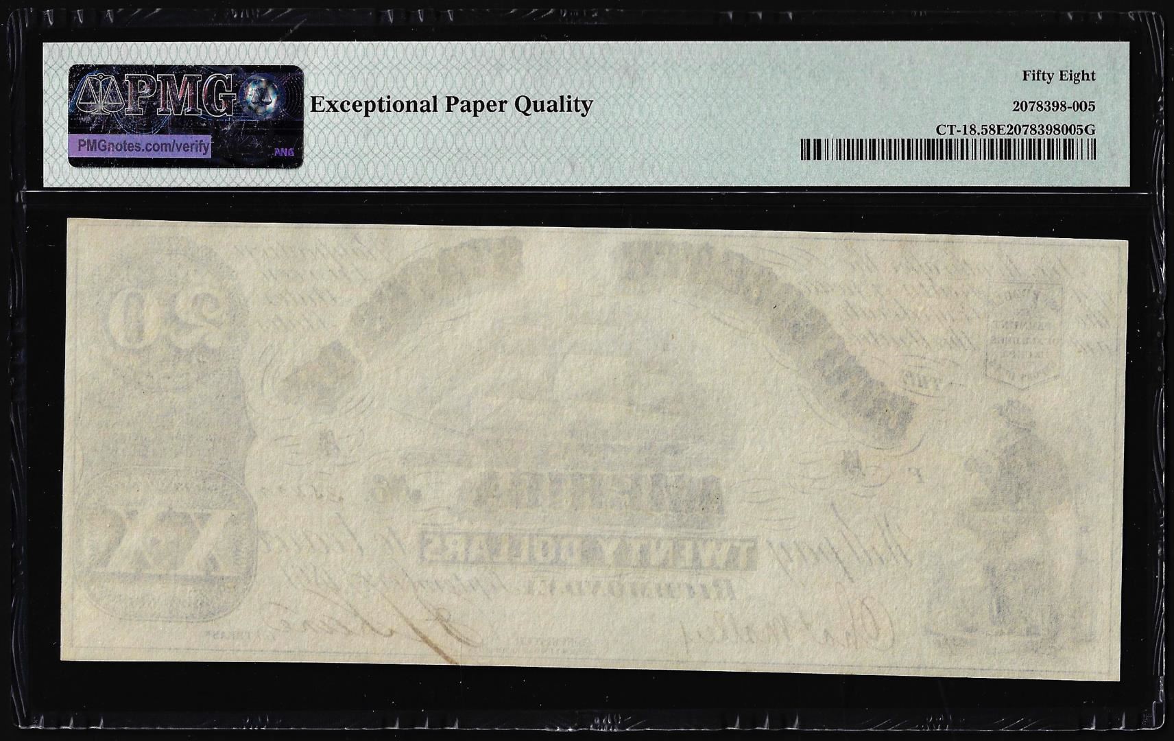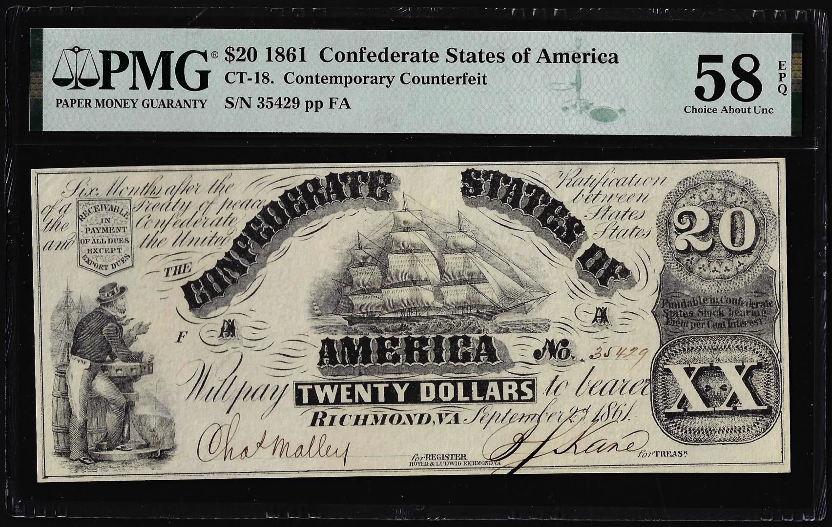 1861 $20 Confederate States Note CT-18 Contemporary Counterfeit PMG Ch. AU58EPQ