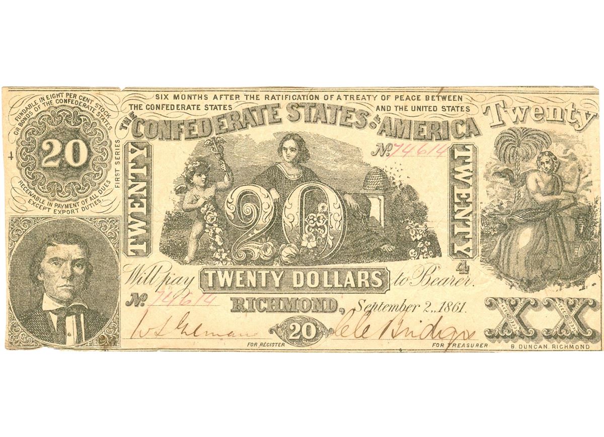One 1861 $20 Confederate States of America Bank Note. Origin: Richmond, Virginia.