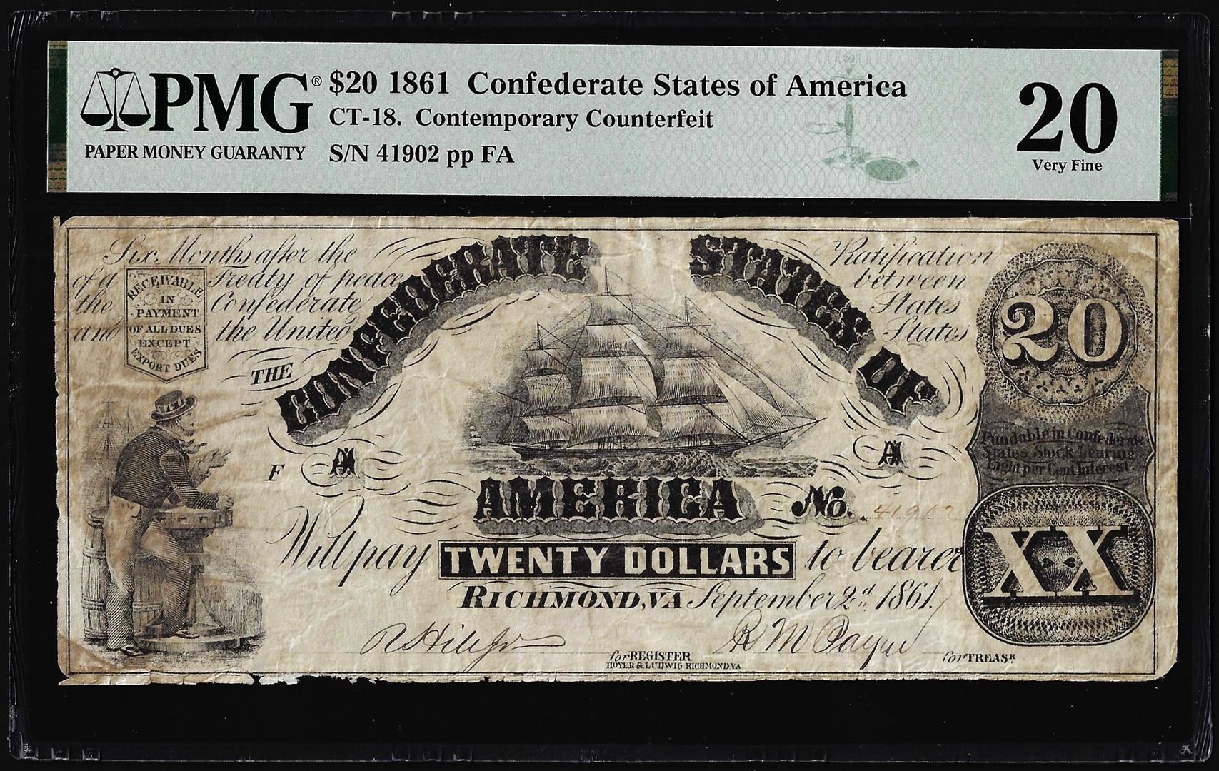 1861 $20 Confederate States of America Contemporary Counterfeit Note CT-18 PMG VF20