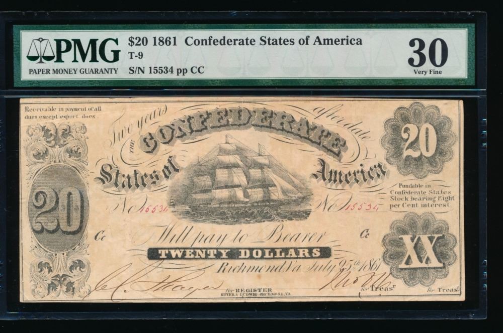 One 1861 $20 Confederate States of America Note PMG 30.