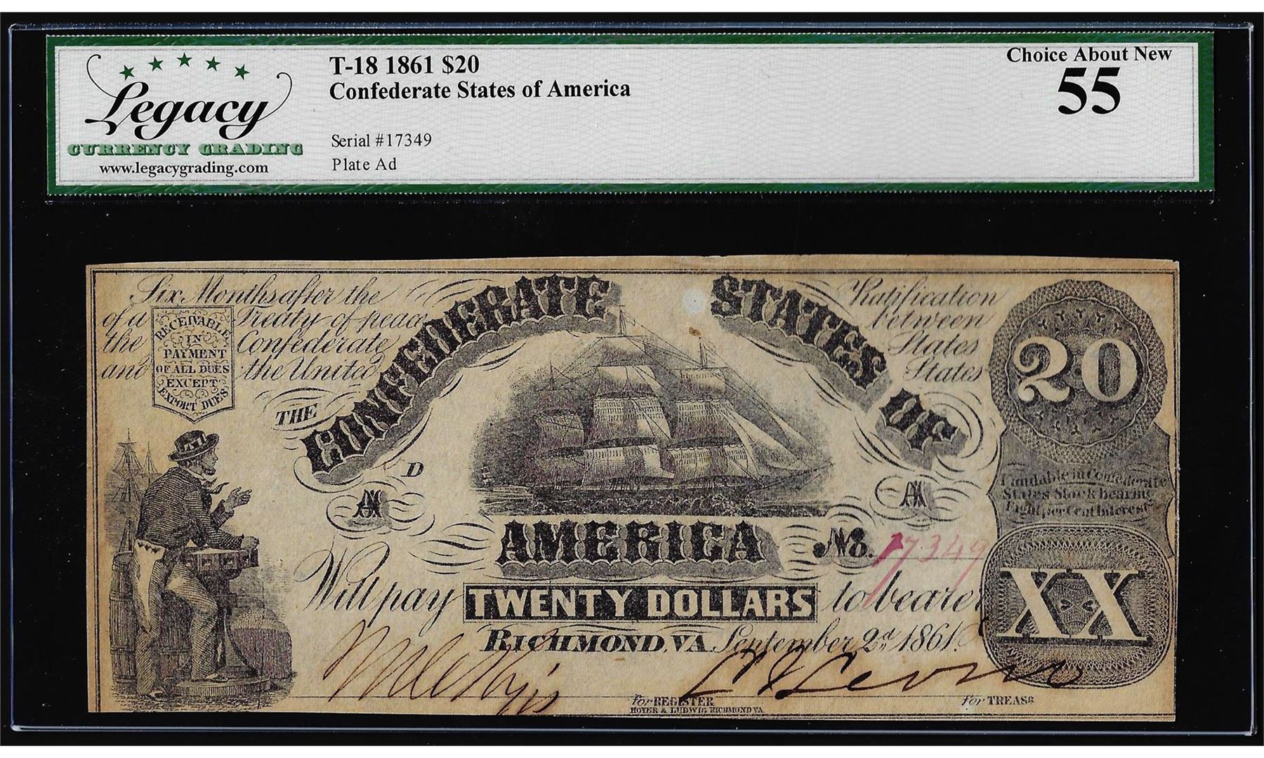 One 1861 $20 Confederate States of America Note T-18 Legacy Choice About New 55. Legacy Graded.