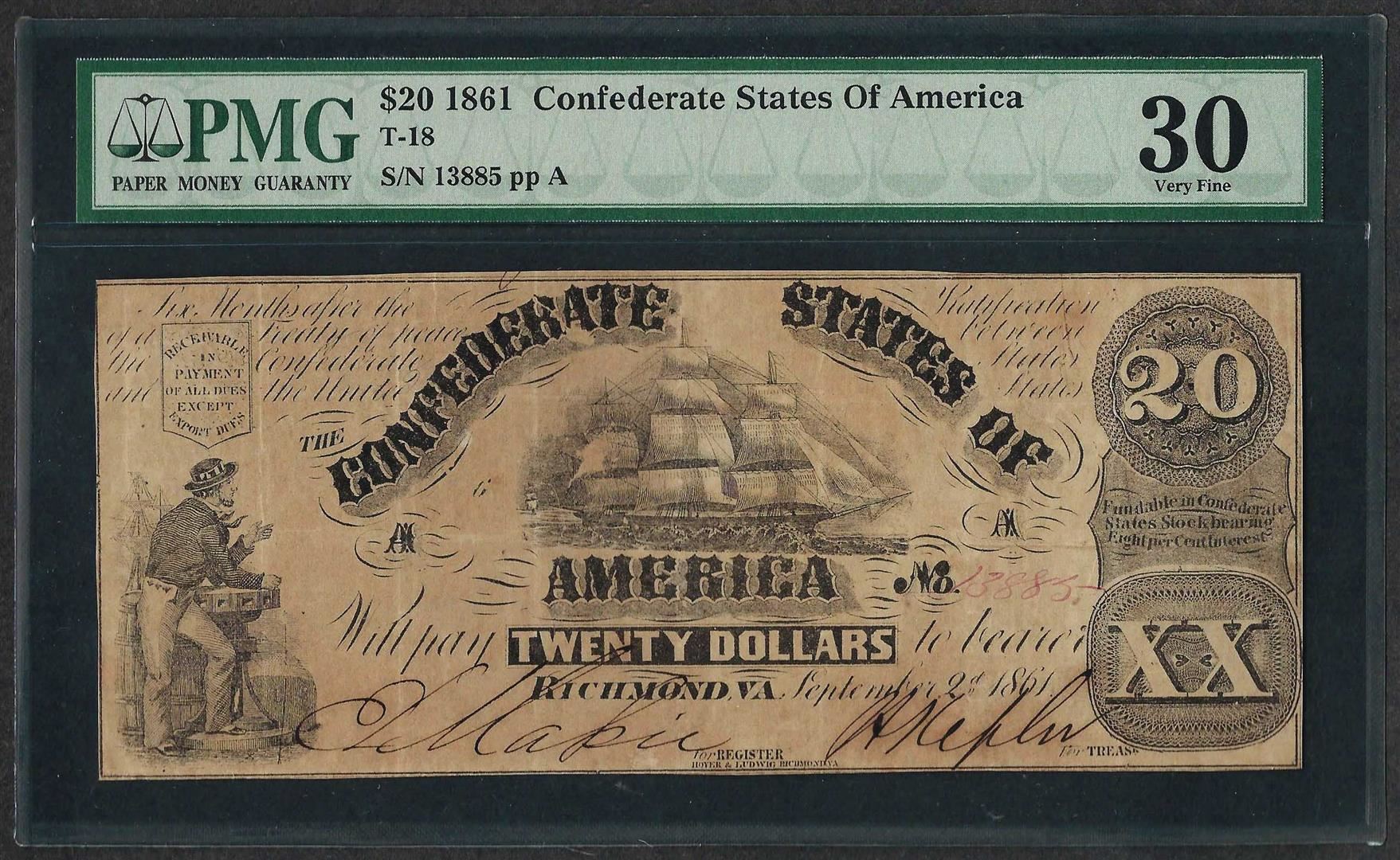 1861 $20 Confederate States of America Note T-18 PMG very Fine 30