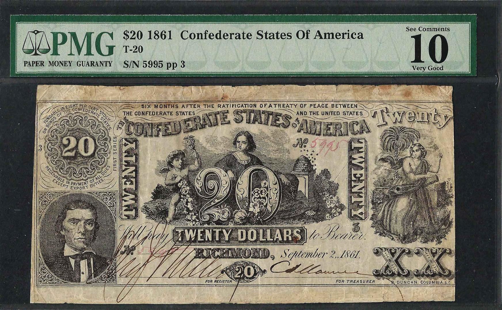 1861 $20 Confederate States of America Note T-20 PMG Very Good 10 Canceled
