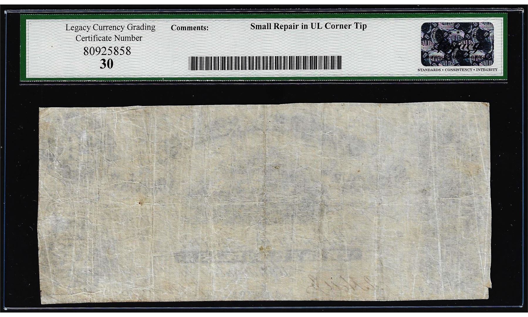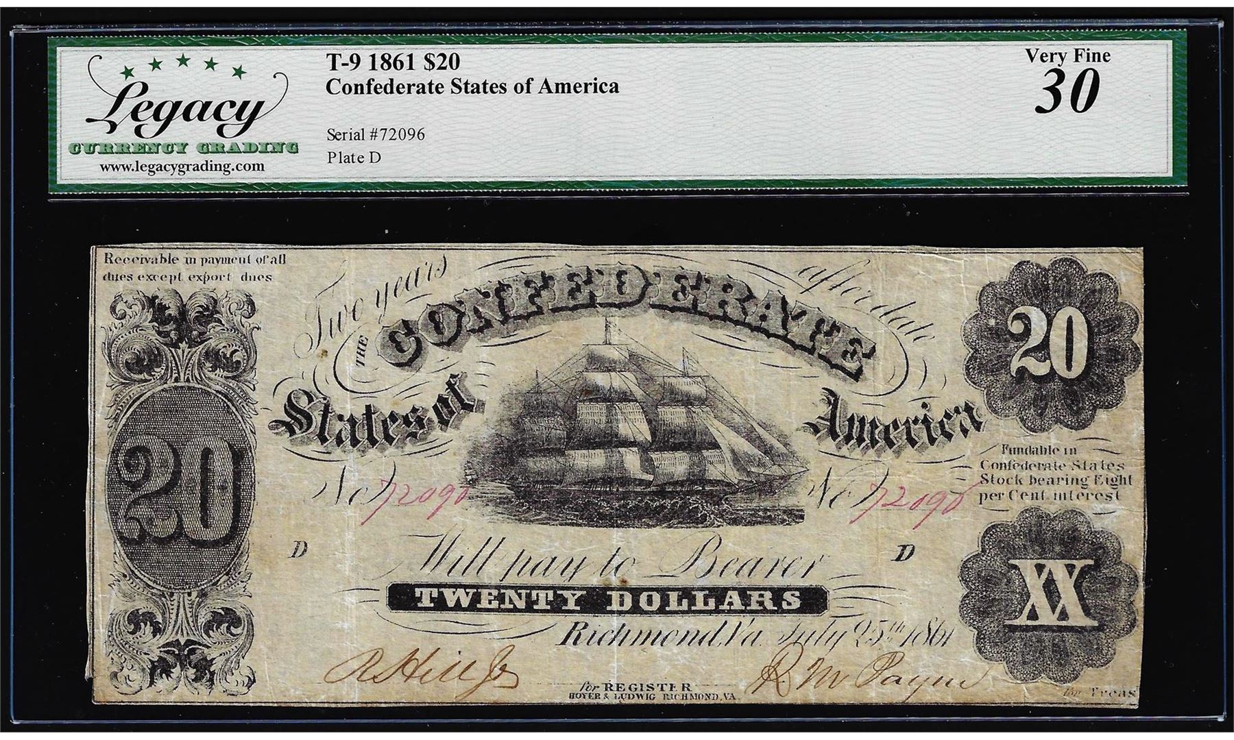 One 1861 $20 Confederate States of America Note T-9 Legacy Very Fine 30. Legacy Graded.