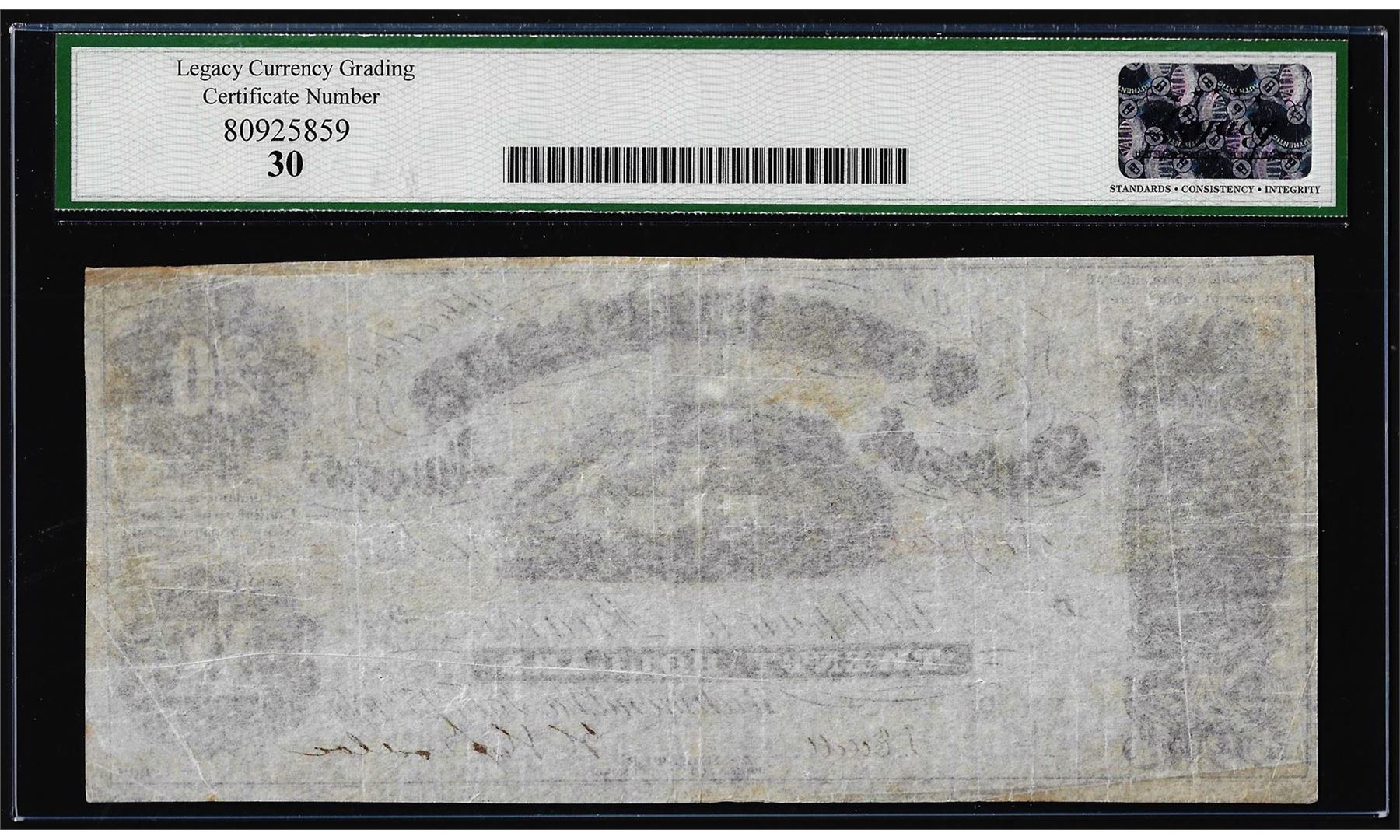 One 1861 $20 Confederate States of America Note T-9 Legacy Very Fine 30. Legacy Graded.
