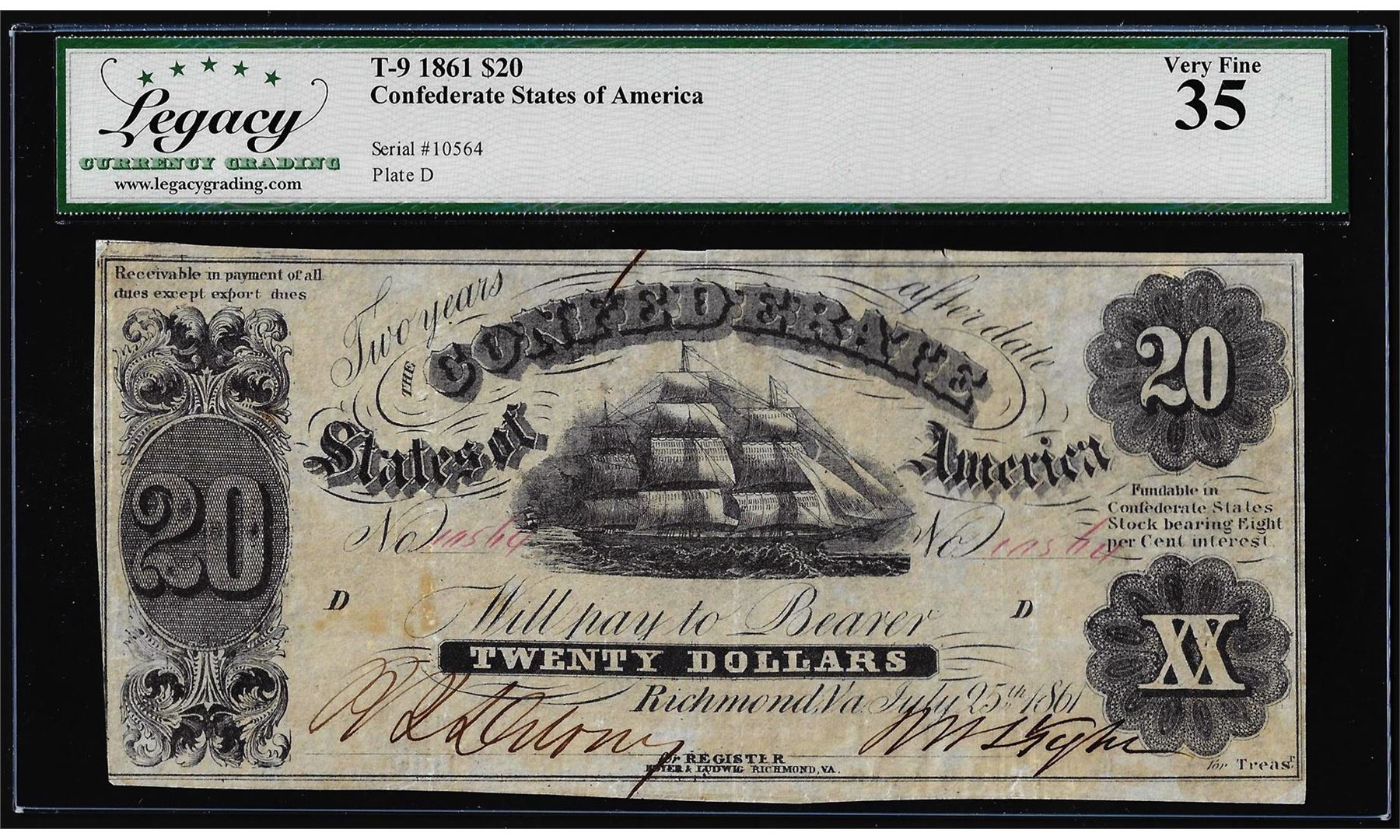 One 1861 $20 Confederate States of America Note T-9 Legacy Very Fine 35. Legacy Graded.