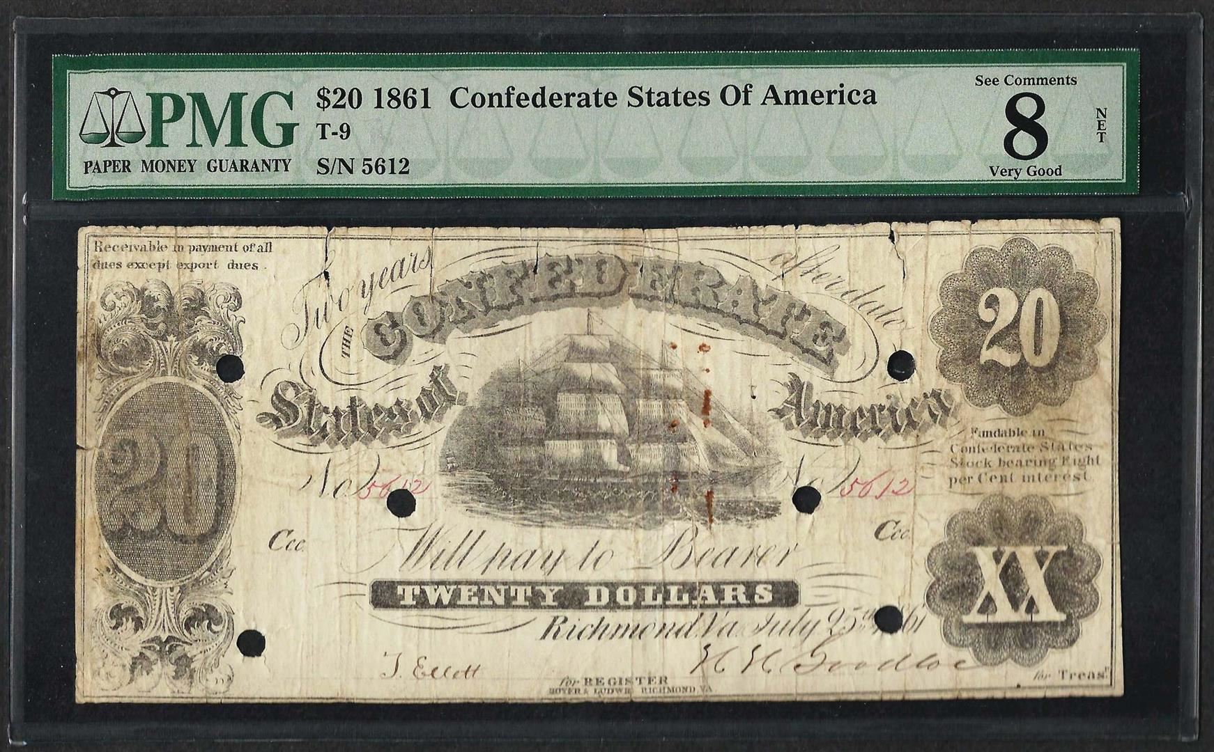 One 1861 $20 Confederate States of America Note T-9 PMG Very Good 8 Net. PMG Certified.