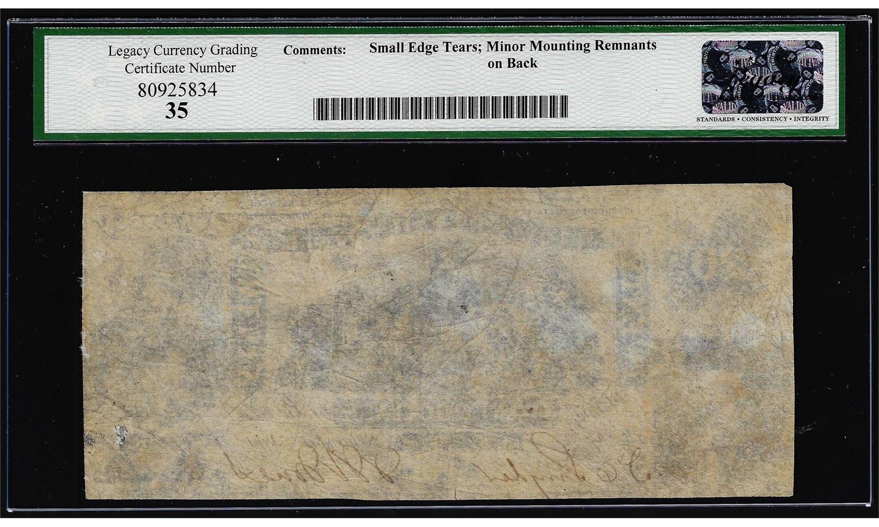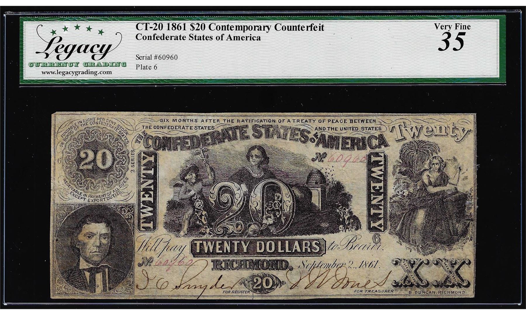 One 1861 $20 Contemporary Counterfeit Confederate States Note CT-20 Legacy Choice VF35. Legacy Graded.