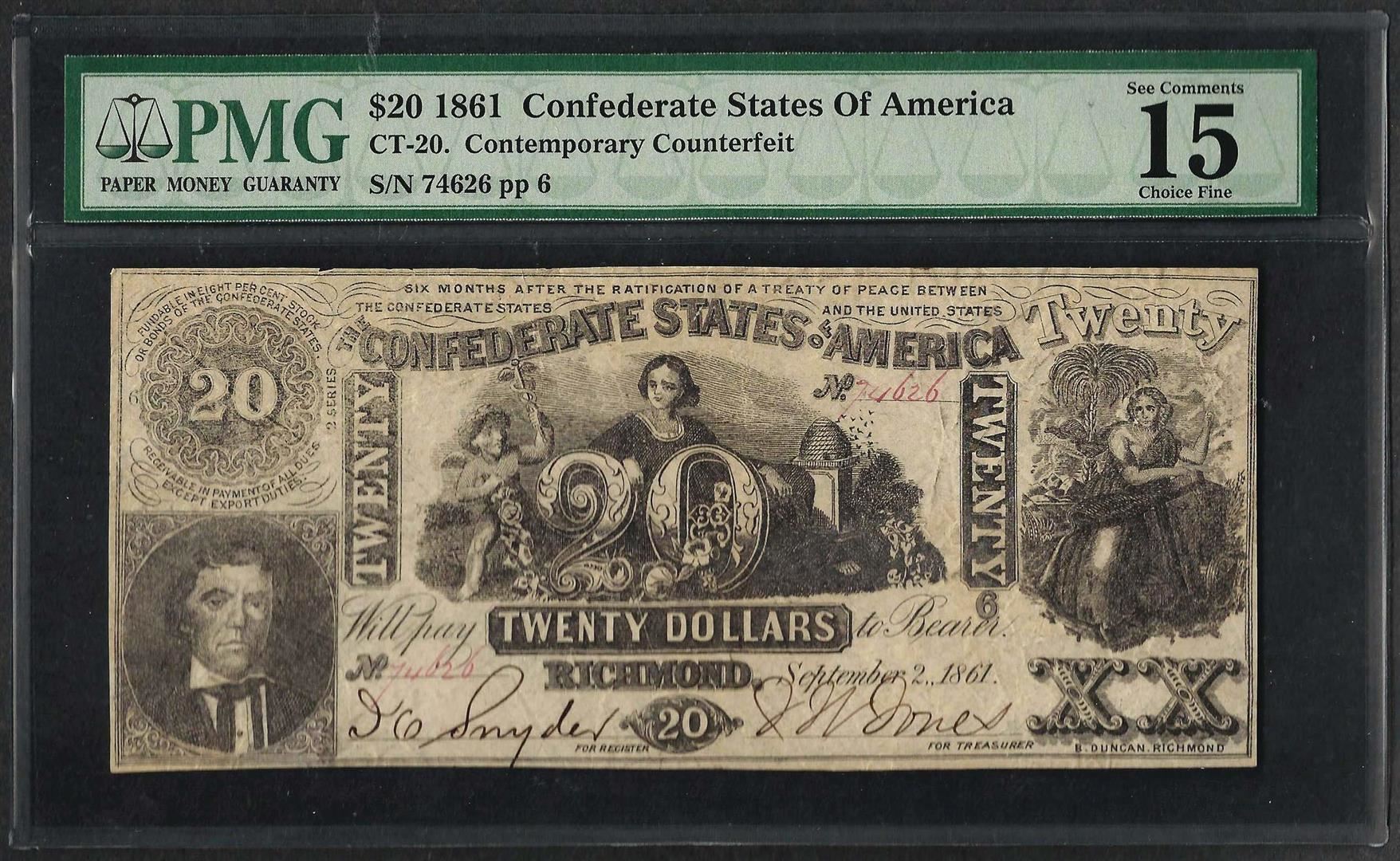 One 1861 $20 Contemporary Counterfeit Confederate States of America Note PMG Choice Fine 15. PMG Certified.
