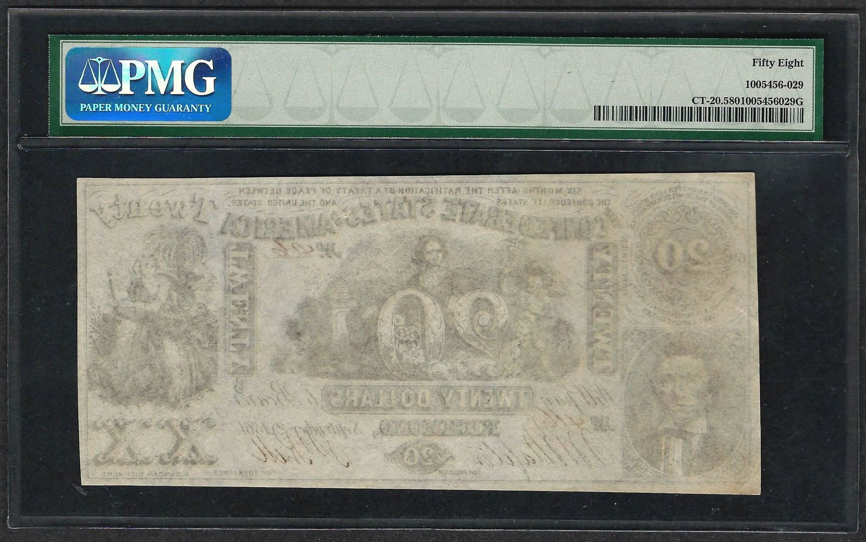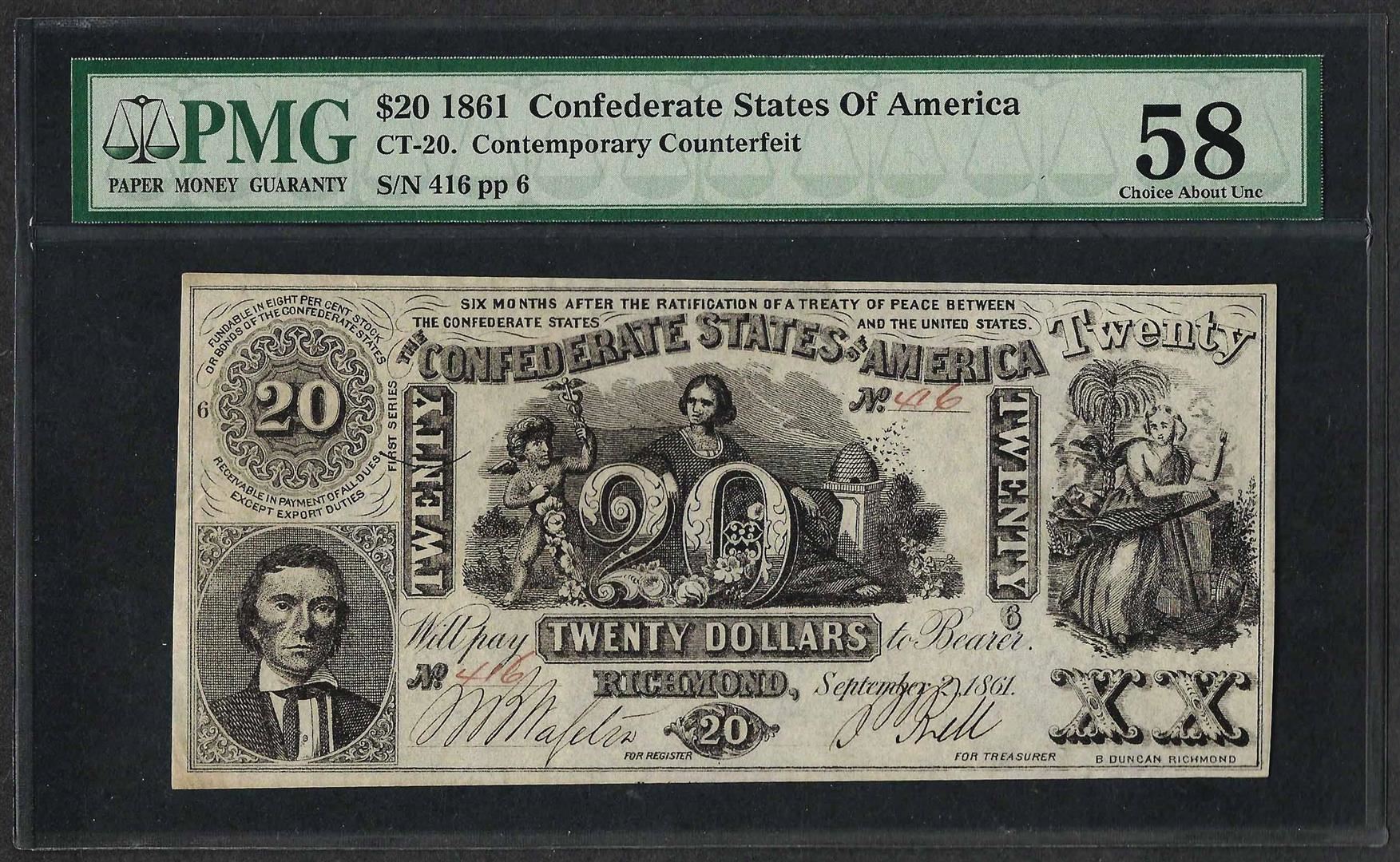 One 1861 $20 Contemporary Counterfeit Confederate States of America Note PMG Choice AU58. PMG Appraised.