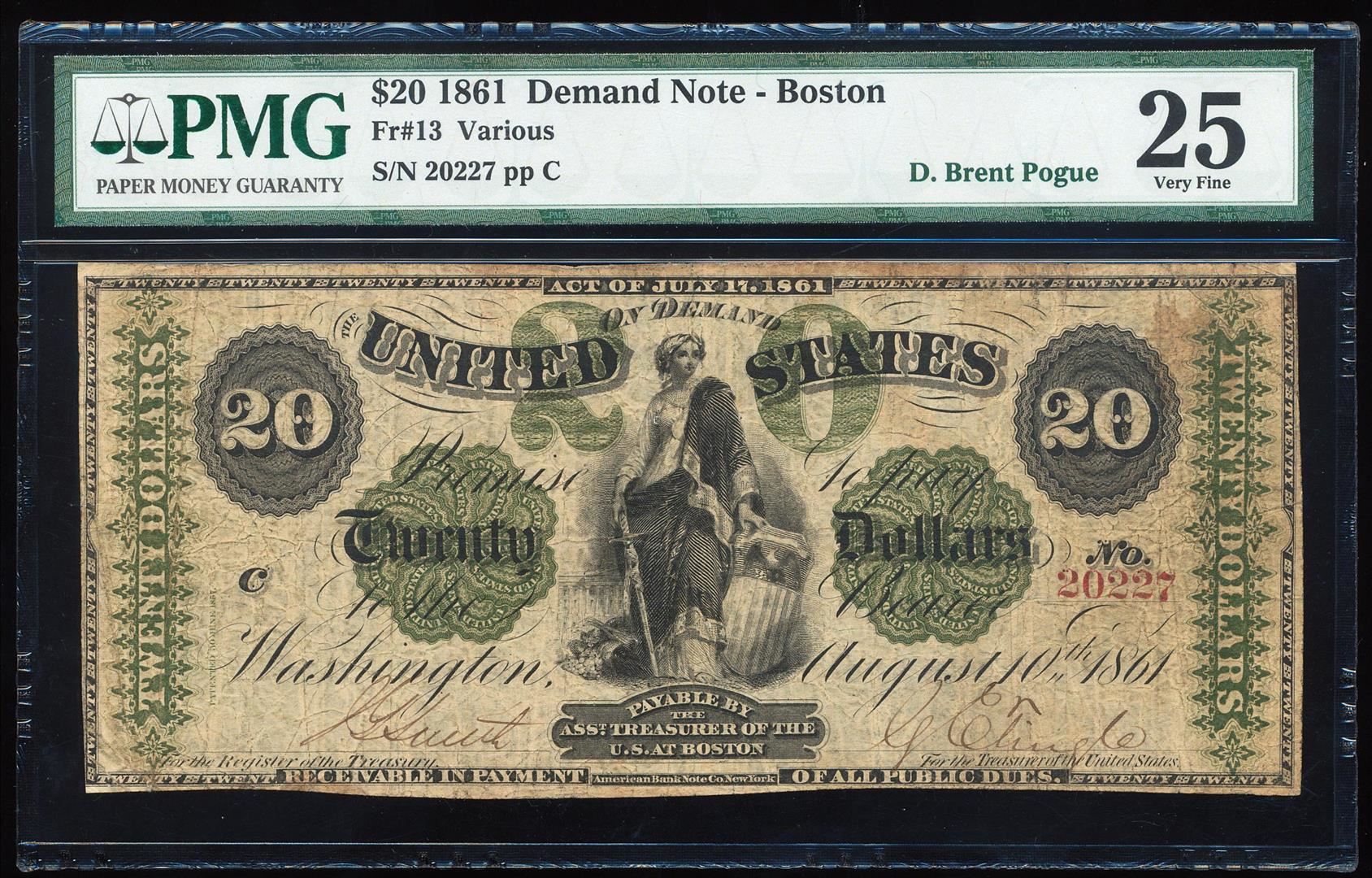 One 1861 $20 Demand Note Boston Fr.13 PMG Very Fine 25.