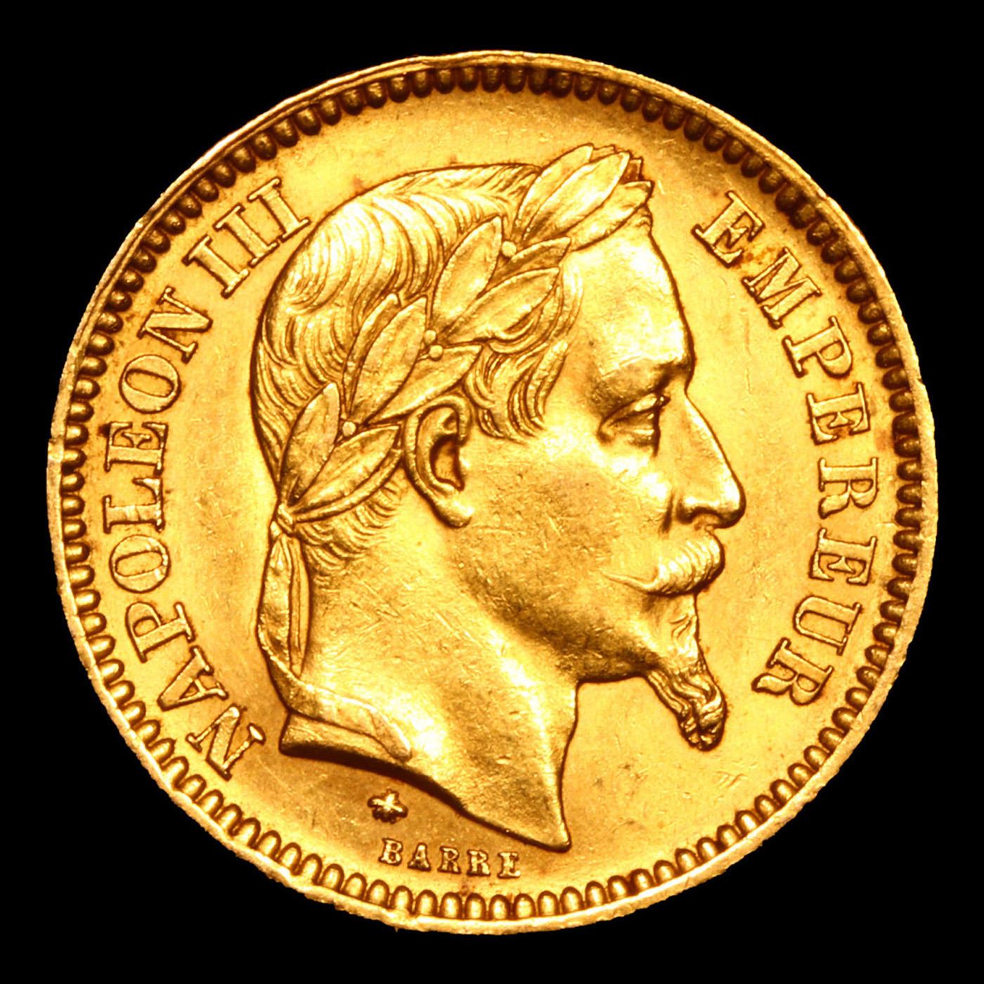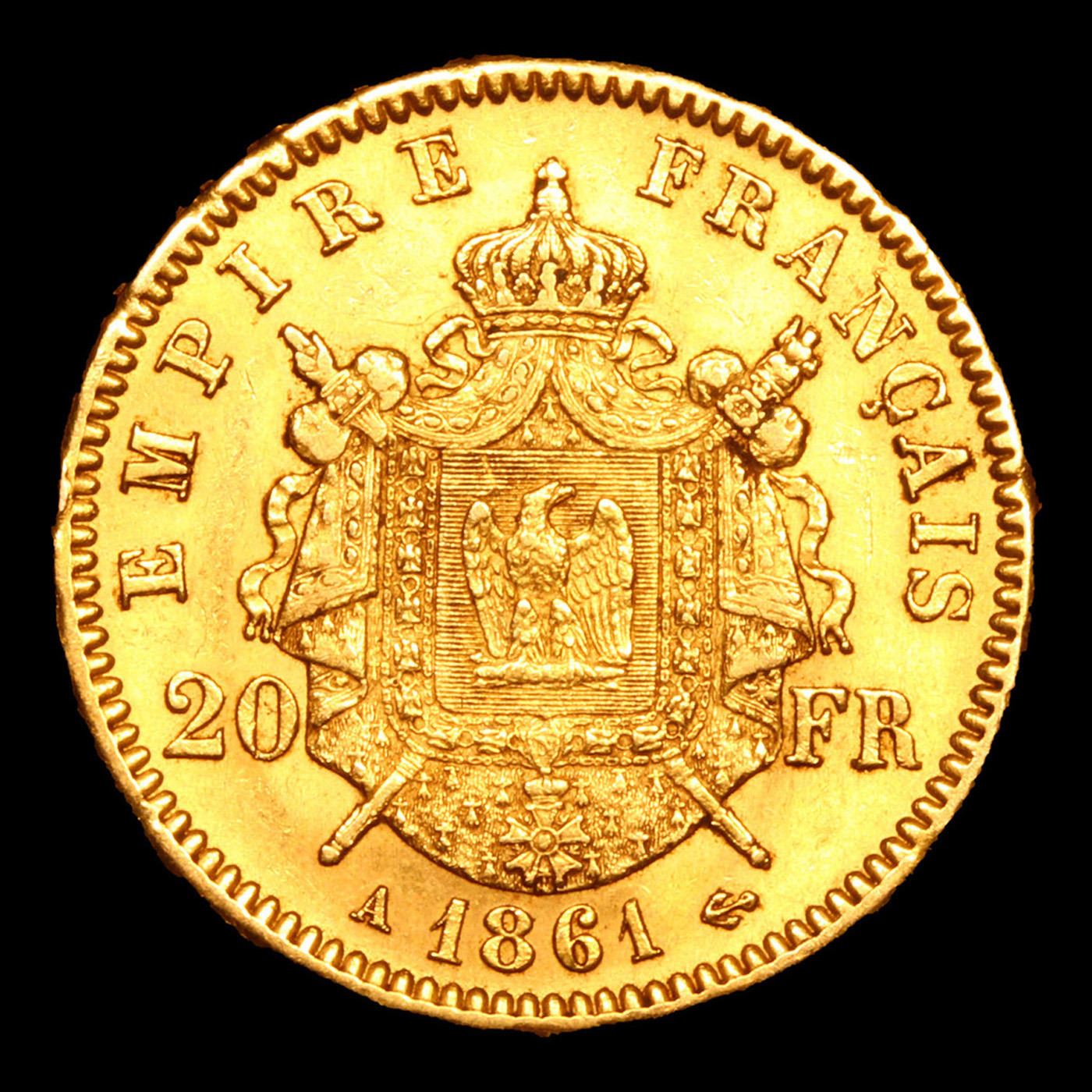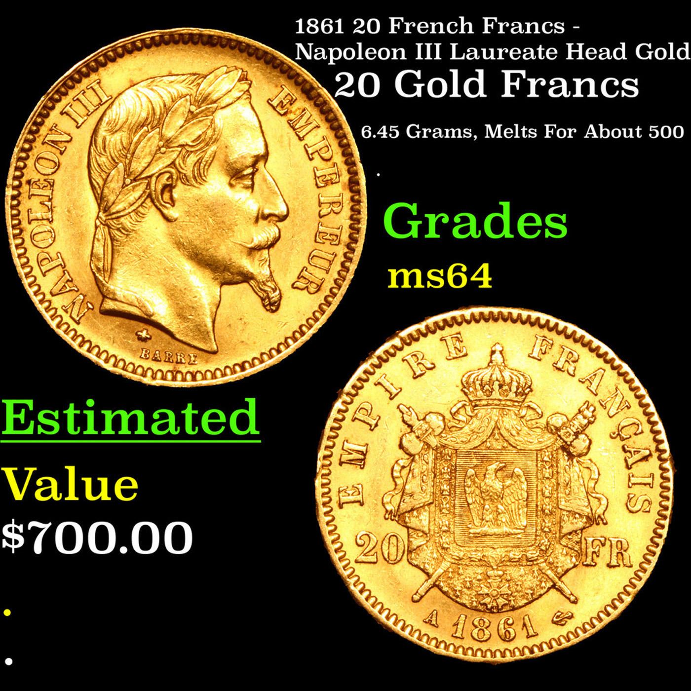 1861 20 French Francs - Napoleon III Laureate Head Gold Grades Choice Unc.