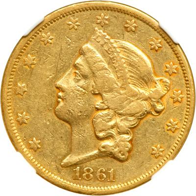 1861 $20 Liberty. NGC graded VF-35. Lightly toned. Inexpensive Type 1 year (PCGS # 8932) .