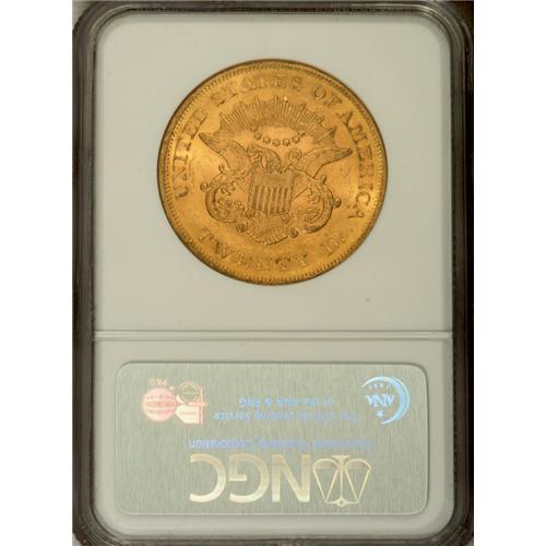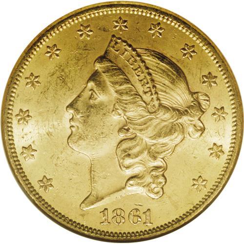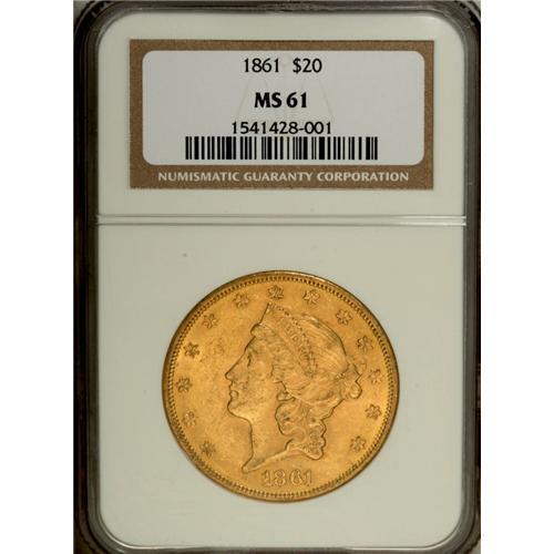 <B>1861 $20 MS61 NGC.</B></I> While the 1861 may be the most easily obtainable Type One double eagle in uncirculated condition, it is highly prized for its Civil War date and overall pleasant appearance. Sharply struck with bright, medium golden luster. Bags marks on this example are commensurate for the grade.<BR><BR><b>Shipping:</b> Coin/Currency (<a target="_blank" href="http://www.heritageauctions.com/common/shipping.php">view shipping information</a>)