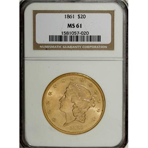 <B>1861 $20 MS61 NGC.</B></I> Jeff Garrett and Ron Guth (2006) write that "The large mintage (nearly 3 million pieces), the highest of any double eagle until 1904, makes the 1861 a common issue in most grades." Brassy-gold surfaces of this MS61 coin exhibit good luster and sharply defined design elements. Minor luster grazes scattered about help account for the grade.<BR><I>From The Diemer L. Fife Collection.</B></I><BR><BR><B>Coin Engraver:</B> James B. Longacre<BR><BR><b>Shipping:</b> Coins & Currency (<a target="_blank" href="http://www.heritageauctions.com/common/shipping.php">view shipping information</a>)