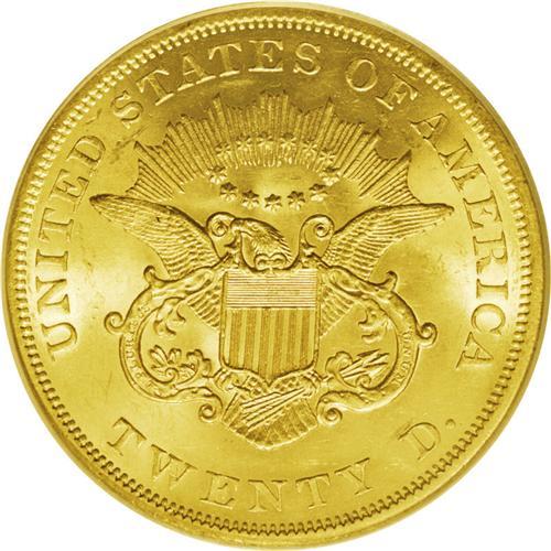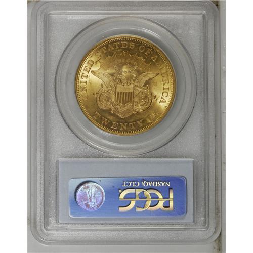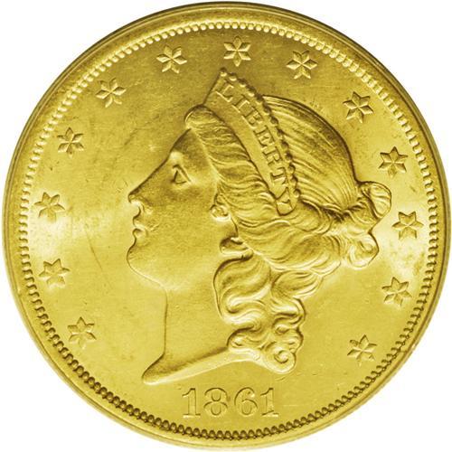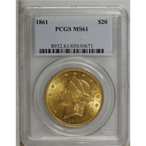 <B>1861<$20> MS61 PCGS.</B></I> The nature of type coins for Type One Liberty Head double eagles has been heavily influenced by recent shipwreck discoveries. Among the most popular choices today are the 1857-S (as a result of the <I>S.S. Central America</B></I>) and the 1861 (from the <I>S.S. Republic.</B></I>) While not a shipwreck piece itself, this example possesses nicely struck devices and highly lustrous yellow-orange surfaces that have few marks overall, though grade-defining pinscratches are visible on Liberty's green- and lavender-tinged neck.