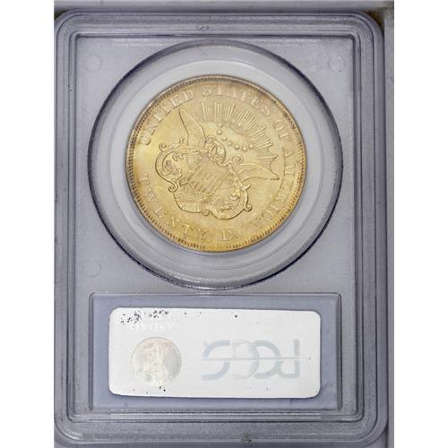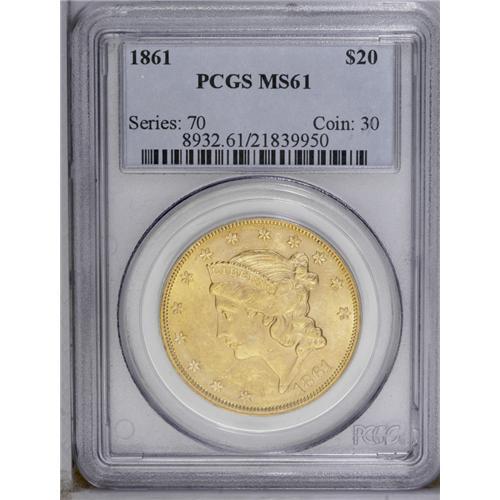 <B>1861<$20> MS61 PCGS.</B></I> This coin offers a generally pleasing appearance, with bold strike and luster typical of the issue, despite a few too many light abrasions to qualify for a higher Mint State grade. A series of milling marks proceeding back from the edge of Liberty's mouth must be mentioned. Pretty straw-gold surfaces. <BR><BR><B>Important notice:</B> Heritage usually auctions material at the rate of 200-250 lots per hour. On some occasions eBay Live bid software or the Internet may not be able to keep up with the pace of the auction. We recommend placing a realistic absentee bid now as insurance to avoid disappointment. Occasionally the auctioneer may eliminate or reject an eBay Live bid, and the auctioneer may also reopen a lot after the close of the eBay live bidding (usually because we missed an audience bid), and may reject your bid even if it shows you as the winning bidder. By bidding via eBay Live, you agree that Heritage may award the lot to another bidder at its sole discretion under the circumstances described above or any other reasonable circumstances. Since eBay bids are not shown to us until we open the lot on the floor, we treat those bids just like floor bids. In most cases the floor responds before the eBay bid is presented to us, due to Internet lag time, so for consistency we have made it a policy that floor bids are always considered first over tie eBay live bids. Also please note that all Heritage lots purchased through eBay Live carry a 20% Buyer's Premium. Please make sure you read the Terms and Conditions before you bid. This lot is being auctioned in conjunction with a live floor auction by Heritage Galleries & Auctioneers. All final auction and invoice information will be supplied by Heritage Galleries & Auctioneers, and all other information should be considered preliminary. Lot:4206 <BR><BR><B>Winning Notification and Billing:</B> After the FINAL session in this auction is complete, Heritage will send e-mail and snail mail invoices. This process normally takes several days. All final auction and invoice information will be supplied by Heritage Galleries & Auctioneers, and all other information should be considered preliminary. <BR><BR>This auction will be conducted on a live auction floor and over the Internet through eBay Live. If you choose to place an absentee bid, please take a moment to <font color='#0000ff'><u><a href='http://pages.ebay.com/liveauctions/help/before/laabsentee.html'>learn how eBay Live absentee bidding works</a></u></font><font color='#000000'>