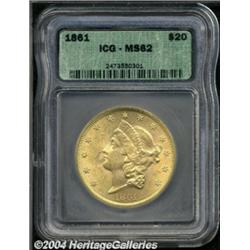 <table><tbody><tr><td><table> <TR><TD width="100%"><TABLE cellSpacing=1 cellPadding=3 width="100%" border=0><TBODY><TR><TD width="100%" bgColor=#79735c><FONT face=arial color=#ffffff size=3><B>Description</B> </FONT></TD></TR><TR><TD width="100%" bgColor=#ffffff><FONT face=arial size=2><B>1861 $20 MS62 ICG.</B></I> The most commonly encountered Type One twenty in all grades, the 1861 makes an impressive type coin and can usually be located in Mint State without too much difficulty. This is a particularly well struck example that has glowing mint luster with a few grade-limiting abrasions on each side.<BR><I>From a Magnificent Collection of Double Eagles.</B></I> </FONT></TD></TR></TBODY></TABLE></TD></TR></TBODY></TABLE><BR><A name=PricesRealized></A><TABLE cellSpacing=0 cellPadding=0 width="100%" bgColor=#000000 border=0><TBODY><TR><TD width="100%"><TABLE cellSpacing=1 cellPadding=3 width="100%" border=0><TBODY><TR><TD width="100%" bgColor=#79735c><A name=PR><FONT face=arial color=#ffffff size=3><B>Previous Prices from Heritage Auctions</B> </FONT></A></TD></TR><TR><TD bgColor=#f6f6ed><TABLE cellSpacing=0 cellPadding=0 width="100%" border=1><TBODY><TR><TD align=middle width="33%"><B>Date</B></TD><TD align=middle width="33%"><B>Service</B></TD><TD align=middle width="33%"><B>Price</B></TD></TR><TR bgColor=whitesmoke><TD width="33%"><B>01/11/2003</B></TD><TD width="33%">NGC</TD><TD width="33%">$3,795.00</TD></TR><TR bgColor=whitesmoke><TD width="33%"><B>08/08/2001</B></TD><TD width="33%">NGC</TD><TD width="33%">$4,025.00</TD></TR><TR bgColor=whitesmoke><TD width="33%"><B>04/05/2001</B></TD><TD width="33%">NGC</TD><TD width="33%">$3,680.00</TD></TR><TR bgColor=whitesmoke><TD width="33%"><B>11/19/1999</B></TD><TD width="33%">PCGS</TD><TD width="33%">$4,370.00</TD></TR><TR bgColor=whitesmoke><TD width="33%"><B>03/13/1999</B></TD><TD width="33%">PCGS</TD><TD width="33%">$5,750.00</TD></TR><TR bgColor=whitesmoke><TD width="33%"><B>01/10/1998</B></TD><TD width="33%">NGC</TD><TD width="33%">$2,990.00</TD></TR><TR bgColor=whitesmoke><TD width="33%"><B>10/12/2000</B></TD><TD width="33%">PCGS</TD><TD width="33%">$4,888.00</TD></TR><TR bgColor=whitesmoke><TD width="33%"><B>01/01/2001</B></TD><TD width="33%">NGC</TD><TD width="33%">$3,565.00</TD></TR><TR bgColor=whitesmoke><TD width="33%"><B>10/01/1999</B></TD><TD width="33%">PCGS</TD><TD width="33%">$4,830.00</TD></TR><TR bgColor=whitesmoke><TD width="33%"><B>05/01/1991</B></TD><TD width="33%">PCGS</TD><TD width="33%">$4,510.00</TD></TR><TR bgColor=whitesmoke><TD width="33%"><B>07/01/1993</B></TD><TD width="33%">PCGS</TD><TD width="33%">$3,410.00</TD></TR><TR bgColor=whitesmoke><TD width="33%"><B>11/01/1994</B></TD><TD width="33%">PCGS</TD><TD width="33%">$3,080.00</TD></TR><TR bgColor=whitesmoke><TD width="33%"><B>05/01/1990</B></TD><TD width="33%">NGC</TD><TD width="33%">$4,620.00</TD></TR></TBODY></TABLE></TD></TR><TR><TD bgColor=#ffffff><FONT face=arial size=1 ?>PLEASE NOTE: All prices realized reflect the final hammer price PLUS the buyer's premium in auctions that charge a buyer's premium. Each item has a notation at the top of the listing indicating whether that lot included a buyer's premium. Example: A item that sells with a final hammer price of $100 and a 20% buyer's premium will display with a price realized of $120. All information listed is intended to be as accurate as possible, but errors are possible. Please use this guide carefully and inform us of any inaccuracies. </FONT></TD></TR></TBODY></TABLE></TD></TR></TBODY></TABLE><BR><TABLE cellSpacing=0 cellPadding=0 width="100%" bgColor=#000000 border=0><TBODY><TR><TD width="100%"><TABLE cellSpacing=1 cellPadding=3 width="100%" border=0><TBODY><TR><TD width="100%" bgColor=#79735c colSpan=6><FONT face=arial color=#ffffff size=3><B>Price Guide*</B> </FONT></TD></TR><TR bgColor=#f6f6ed><TD align=middle><B>Grade</B> </TD><TD align=middle><B>Coin World<BR>(Trends)</B> </TD><TD align=middle><B>Numismedia<BR>Retail</B> </TD><TD align=middle><B>Numismedia<BR>Wholesale</B> </TD><TD align=middle><B>Coin<BR>Universe</B> </TD><TD align=middle><B>Heritage<BR>Value Index</B> </TD></TR><TR bgColor=#ffffff><TD align=middle>61</TD><TD align=right>---</TD><TD align=right>---</TD><TD align=right>$2,875.00</TD><TD align=right>$4,000.00</TD><TD align=right>$2,902.38</TD></TR><TR style="FONT-WEIGHT: bold" bgColor=#cccfdd><TD align=middle>62</TD><TD align=right>$6,000.00</TD><TD align=right>---</TD><TD align=right>$4,250.00</TD><TD align=right>$5,500.00</TD><TD align=right>$3,913.33</TD></TR><TR bgColor=#ffffff><TD align=middle>63</TD><TD align=right>$10,000.00</TD><TD align=right>---</TD><TD align=right>$7,725.00</TD><TD align=right>$8,750.00</TD><TD align=right>$6,445.00</TD></TR><TR bgColor=#ffffff><TD colSpan=6><FONT size=1>*All information listed is intended to be as accurate as possible, but errors are possible. No item may be returned or refused based on this information which is provided as a service to our customers. You should contact each pricing source directly to determine the accuracy of this information. </FONT></TD></TR></TBODY></TABLE></TD></TR></TBODY></TABLE><BR><TABLE cellSpacing=0 cellPadding=0 width="100%" bgColor=#000000 border=0><TBODY><TR><TD width="100%"><TABLE cellSpacing=1 cellPadding=3 width="100%" border=0><TBODY><TR><TD width="100%" bgColor=#79735c><FONT face=arial color=#ffffff size=3><B>Population Guide</B> </FONT></TD></TR><TR bgColor=#ffffff><TD align=middle><!-- Begin Output of Population Grid--><TABLE cellSpacing=0 cellPadding=0 width="100%" border=0><TBODY><TR><TD vAlign=center><TABLE cellSpacing=0 width="100%" border=1 cellsadding="3"><TBODY><TR><TD vAlign=center><TABLE cellSpacing=0 cellPadding=3 width="100%" border=1><TBODY><TR><TD vAlign=center align=middle bgColor=#f0f1e8 colSpan=2 <CENTER><FONT face=Arial size=2><B>PCGS Pop </B></FONT><CENTER></CENTER></TD><TD vAlign=center align=middle bgColor=#f0f1e8 colSpan=2><CENTER><FONT face=Arial size=2><B>NGC Pop</B></CENTE