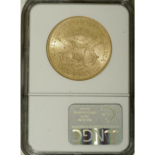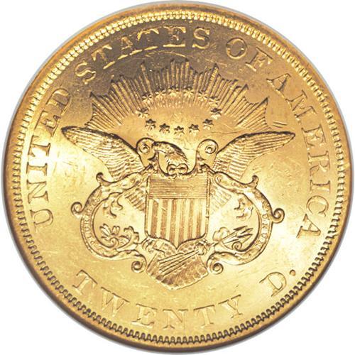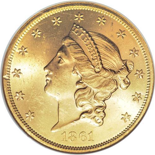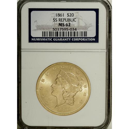 <B>1861 $20 MS62 NGC.</B></I> Ex: S.S. Republic. Gold coins did not circulate during the Civil War, so it comes as little surprise that the 1865 shipwreck of the <I>S.S. Republic</B></I> contained Uncirculated double eagles struck four years earlier. Such pieces were used as a store of wealth, while financial transactions depended upon unbacked paper money. This thoroughly lustrous example has an intricate strike and only a single noticeable mark, which is relegated to the obverse rim at 9 o'clock.<BR><BR><b>Shipping:</b> Coins & Currency (<a target="_blank" href="http://www.heritageauctions.com/common/shipping.php">view shipping information</a>)