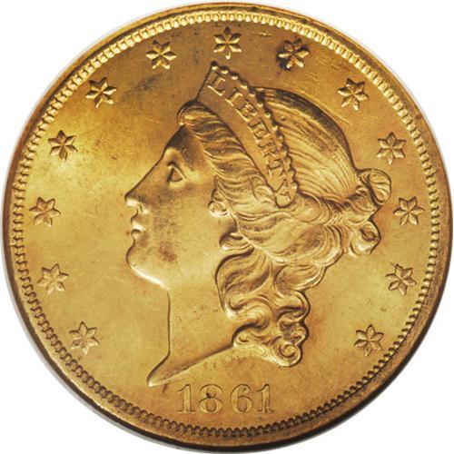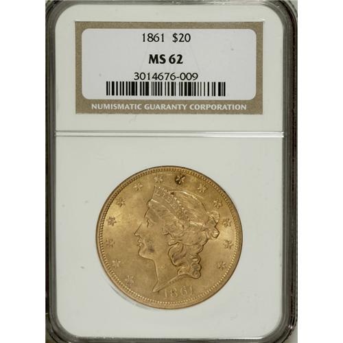 <B>1861 $20 MS62 NGC.</B></I> The mintage of the 1861 double eagle, nearly 3 million pieces at the start of the Civil War, was the largest double eagle production at any mint until the enormous 1904 emissions in both Philadelphia and San Francisco. This piece boasts smooth, lustrous orange-gold surfaces with a bold strike and good eye appeal.<BR><BR><b>Shipping:</b> Coins & Currency (<a target="_blank" href="http://www.heritageauctions.com/common/shipping.php">view shipping information</a>)