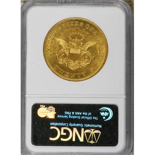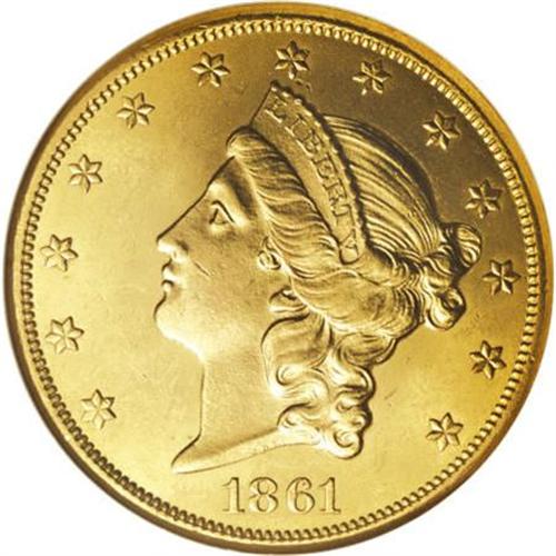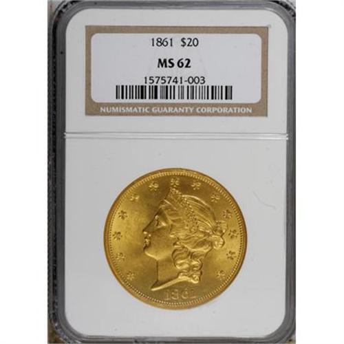 <B>1861 $20 MS62 NGC.</B></I> The fields are uncommonly smooth for the grade, although extensive scrutiny with a loupe locates some inconspicuous marks on the cheek. The recovery of the S.S. Republic has made the 1861 affordable in Mint State, but examples remain scarce relative to demand, partly because of its Civil War date.<BR><BR><B>Coin Engraver:</B> James B. Longacre<BR><BR><b>Shipping:</b> Coins & Currency (<a target="_blank" href="http://www.heritageauctions.com/common/shipping.php">view shipping information</a>)