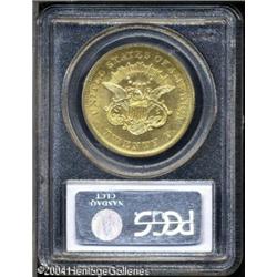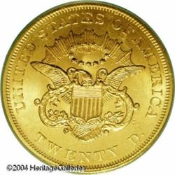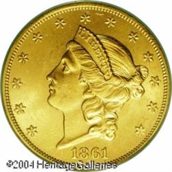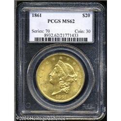 1861 $20 MS62 PCGS. The 1861 has the highest minta <B>1861 $20 MS62 PCGS.</B></I> The 1861 has the highest mintage figure of any Liberty Head Double Eagle until 1904. As one might expect, it is among the more common issues of this design. Until the discovery of the <I>S.S. Central America,</B></I> this date was likely to be included in type sets where a single affordable, high grade representative was needed. True to form, this piece has bright mint frost and unusually clean surfaces for the grade. Sharply struck overall, and still a great type coin for the grade. <BR><BR><B>Important notice:</B> Heritage usually auctions material at the rate of 200-250 lots per hour. On some occasions eBay Live bid software or the Internet may not be able to keep up with the pace of the auction. We recommend placing a realistic absentee bid now as insurance to avoid disappointment. Occasionally the auctioneer may eliminate or reject an eBay Live bid, and the auctioneer may also reopen a lot after the close of the eBay live bidding (usually because we missed an audience bid), and may reject your bid even if it shows you as the winning bidder. By bidding via eBay Live, you agree that Heritage may award the lot to another bidder at its sole discretion under the circumstances described above or any other reasonable circumstances. Since eBay bids are not shown to us until we open the lot on the floor, we treat those bids just like floor bids. In most cases the floor responds before the eBay bid is presented to us, due to Internet lag time, so for consistency we have made it a policy that floor bids are always considered first over tie eBay live bids. Also please note that all Heritage lots purchased through eBay Live carry a 20% Buyer's Premium. Please make sure you read the Terms and Conditions before you bid. This lot is being auctioned in conjunction with a live floor auction by Heritage Galleries & Auctioneers. All final auction and invoice information will be supplied by Heritage Galleries & Auctioneers, and all other information should be considered preliminary. Lot:6849