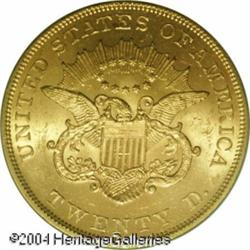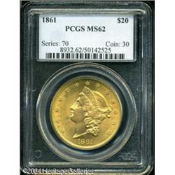 1861 $20 MS62 PCGS. While the 1861 may be the most <B>1861 $20 MS62 PCGS.</B></I> While the 1861 may be the most easily obtainable Type One Liberty Twenty Dollar, it is highly prized for its Civil War date and overall good appearance. Well struck with bright, medium-yellow luster and minimal marks for the grade. <BR><BR><B>Important notice:</B> Heritage usually auctions material at the rate of 200-250 lots per hour. On some occasions eBay Live bid software or the Internet may not be able to keep up with the pace of the auction. We recommend placing a realistic absentee bid now as insurance to avoid disappointment. Occasionally the auctioneer may eliminate or reject an eBay Live bid, and the auctioneer may also reopen a lot after the close of the eBay live bidding (usually because we missed an audience bid), and may reject your bid even if it shows you as the winning bidder. By bidding via eBay Live, you agree that Heritage may award the lot to another bidder at its sole discretion under the circumstances described above or any other reasonable circumstances. Since eBay bids are not shown to us until we open the lot on the floor, we treat those bids just like floor bids. In most cases the floor responds before the eBay bid is presented to us, due to Internet lag time, so for consistency we have made it a policy that floor bids are always considered first over tie eBay live bids. Also please note that all Heritage lots purchased through eBay Live carry a 20% Buyer's Premium. Please make sure you read the Terms and Conditions before you bid. This lot is being auctioned in conjunction with a live floor auction by Heritage Galleries & Auctioneers. All final auction and invoice information will be supplied by Heritage Galleries & Auctioneers, and all other information should be considered preliminary. Lot:6848