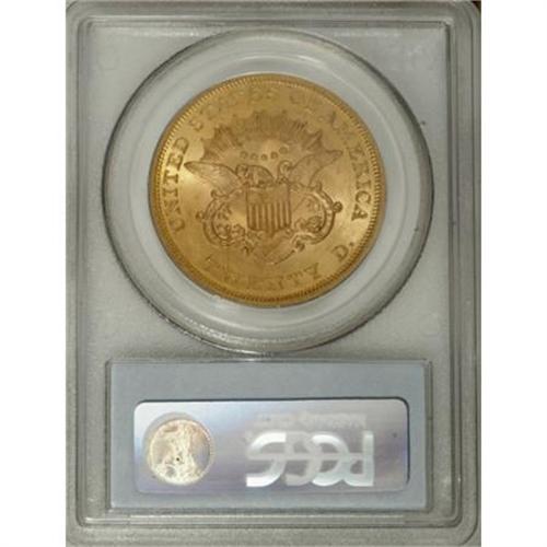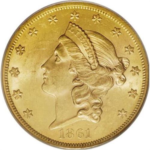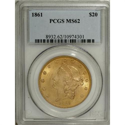 <B>1861 $20 MS62 PCGS.</B></I> Ebullient luster and lovely rose-gold coloration ensure the splendid eye appeal of this Mint State example. Typically well struck and nicely preserved, the shimmering surfaces only have a few grade-limiting marks, and these seem minimal for the grade. This issue was once the most common of Type I double eagles; that changed after the recovery of many 1857-S examples from the wreck of the <I>S.S. Central America</B></I>. Population: 64 in 62, 47 finer (7/07). <BR><BR><B>Coin Engraver:</B> James B. Longacre<BR><BR><b>Shipping:</b> Coins & Currency (<a target="_blank" href="http://www.heritageauctions.com/common/shipping.php">view shipping information</a>\)