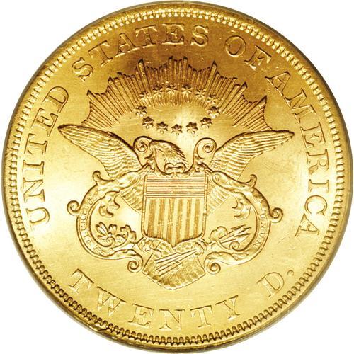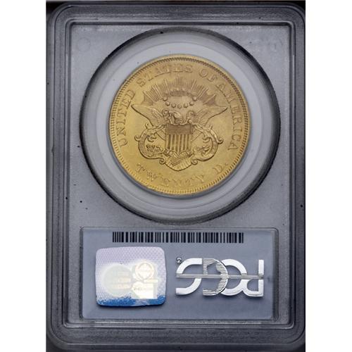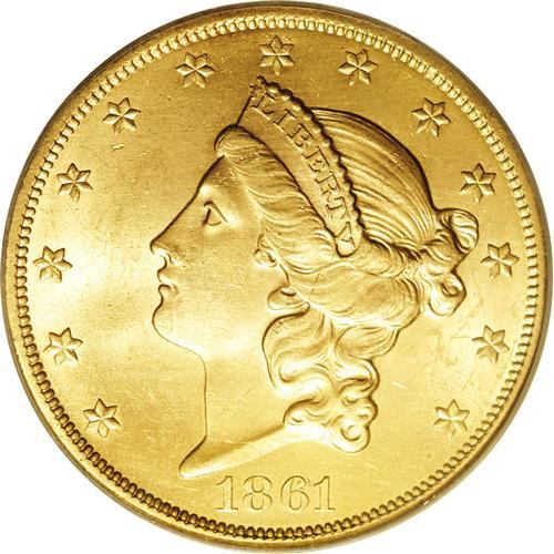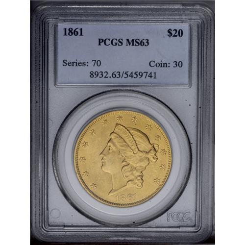 <B>1861<$20> MS63 PCGS.</B></I> Even at the MS63 level--unusual for a large pre-Civil War double eagle--this coins seems conservatively graded at first glance. The present cataloger would not have been at all surprised if this coin were in an MS64 holder. The swirling luster is virtually unbroken, there are <I>spectacularly</B></I> few abrasions, and the strike is nearly full, save perhaps for slight weakness on the eagle's wingtips. Only to quibble, there are a couple of tiny dotlike indentations on the hair below the coronet, and there is a hit near star 5. The reverse shows two light scrapes, one within the ring of stars, the other beneath the eagle's tail feathers--but all of this nitpicking would not even be mentionable on a coin of lesser quality. Incredibly appealing! Population: 30 in 63, 15 finer (3/06). <BR><BR><B>Important notice:</B> Heritage usually auctions material at the rate of 200-250 lots per hour. On some occasions eBay Live bid software or the Internet may not be able to keep up with the pace of the auction. We recommend placing a realistic absentee bid now as insurance to avoid disappointment. Occasionally the auctioneer may eliminate or reject an eBay Live bid, and the auctioneer may also reopen a lot after the close of the eBay live bidding (usually because we missed an audience bid), and may reject your bid even if it shows you as the winning bidder. By bidding via eBay Live, you agree that Heritage may award the lot to another bidder at its sole discretion under the circumstances described above or any other reasonable circumstances. Since eBay bids are not shown to us until we open the lot on the floor, we treat those bids just like floor bids. In most cases the floor responds before the eBay bid is presented to us, due to Internet lag time, so for consistency we have made it a policy that floor bids are always considered first over tie eBay live bids. Also please note that all Heritage lots purchased through eBay Live carry a 20% Buyer's Premium. Please make sure you read the Terms and Conditions before you bid. This lot is being auctioned in conjunction with a live floor auction by Heritage Galleries & Auctioneers. All final auction and invoice information will be supplied by Heritage Galleries & Auctioneers, and all other information should be considered preliminary. Lot:4207 <BR><BR><B>Winning Notification and Billing:</B> After the FINAL session in this auction is complete, Heritage will send e-mail and snail mail invoices. This process normally takes several days. All final auction and invoice information will be supplied by Heritage Galleries & Auctioneers, and all other information should be considered preliminary. <BR><BR>This auction will be conducted on a live auction floor and over the Internet through eBay Live. If you choose to place an absentee bid, please take a moment to <font color='#0000ff'><u><a href='http://pages.ebay.com/liveauctions/help/before/laabsentee.html'>learn how eBay Live absentee bidding works</a></u></font><font color='#000000'>