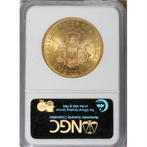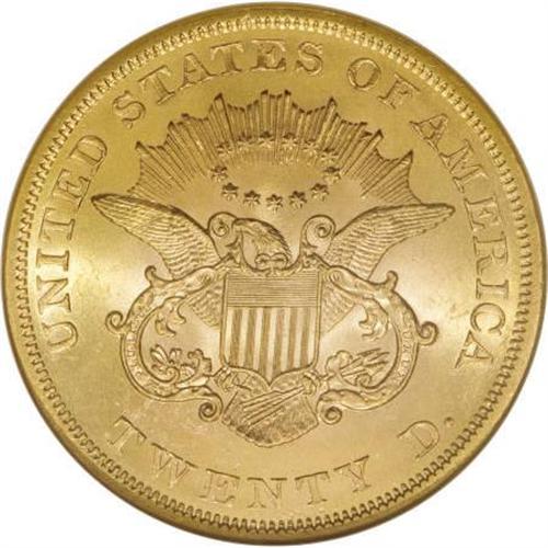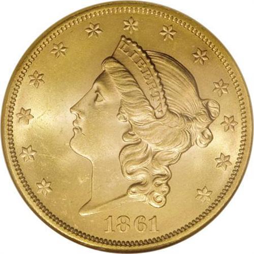 <B>1861 $20 MS64 NGC.</B></I> The absolutely gorgeous, coruscating radiant luster is more characteristic of an S-mint Morgan dollar than what one usually sees on Type One Libertys. Moreover, while the generous mintage of nearly 3 million pieces makes this the most available Type One Liberty and the one that collectors turn to for type purposes, in Choice condition the issue is actually quite rare (Garrett and Guth, 2006). As testament to that assertion, NGC and PCGS as of this writing (6/07) have certified only 33 pieces in MS64, with 15 finer--and that small population includes the nearly 500 examples found aboard the <I>S.S. Republic! <BR></B></I> Aside from the phenomenal luster, the present example offers attractive orange-gold coloration and a bold strike. Mentionable abrasions are nil. Competition should be deservedly fierce for this piece. Census: 22 in 64, 10 finer (6/07).<BR><BR><b>Shipping:</b> Coins & Currency (<a target="_blank" href="http://www.heritageauctions.com/common/shipping.php">view shipping information</a>)